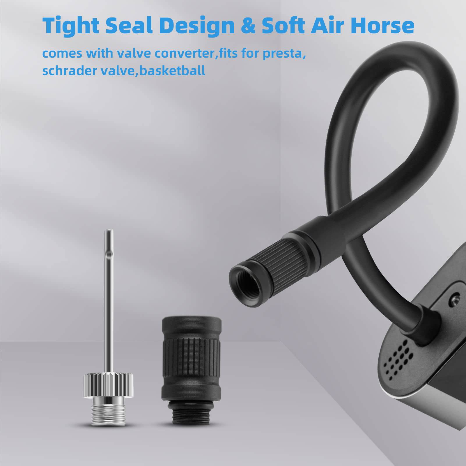 - Fast-inflating pump: portable electric pump with an air pressure of up to 150 PSI/10.3 bar. Inflates a bicycle tire fully in 2-3 minutes. Includes American nozzle, French nozzle, and ball-head needle.