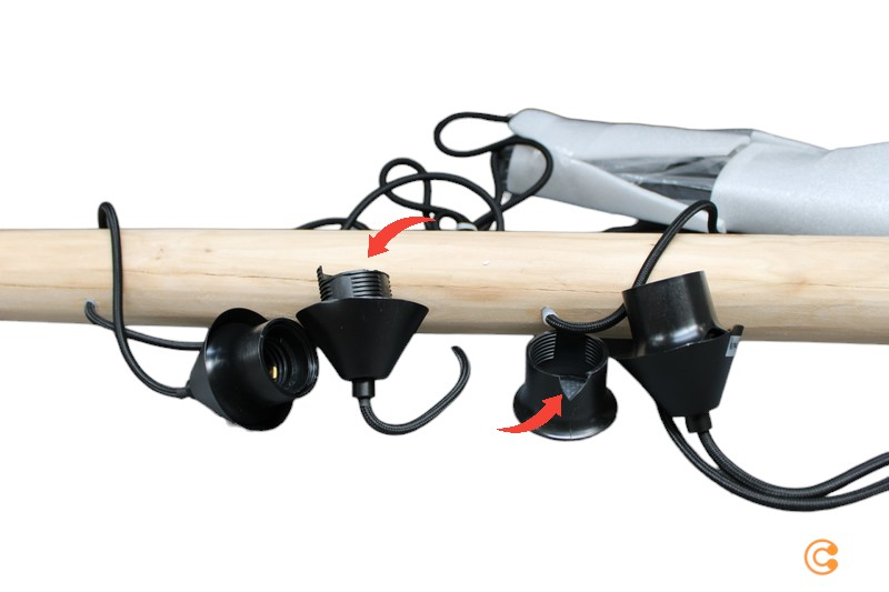 Ropes are wound around the branch. The black rope creates a striking contrast to the light wood. The natural wood also contrasts with the delicate metal frame of the umbrellas. The four suspension points can be adjusted to different heights to create a more dynamic overall look.