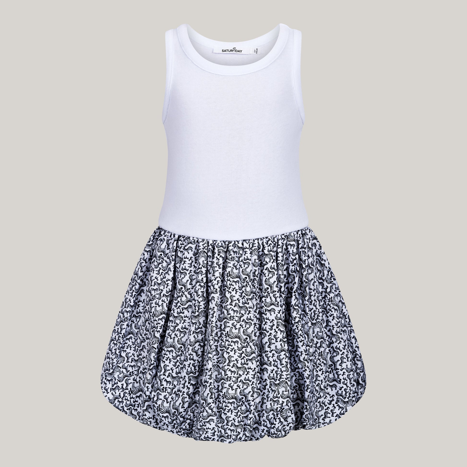 Bereit für die nächste große Entdeckungstour? Dieses Kleid bringt den wilden Safari-Spirit in den Alltag – mit einem luftigen Balloonrock voller frecher Zebras und einem coolen Tank-Top-Oberteil, das für freie Arme und jede Menge Bewegungsfreiheit sorgt.