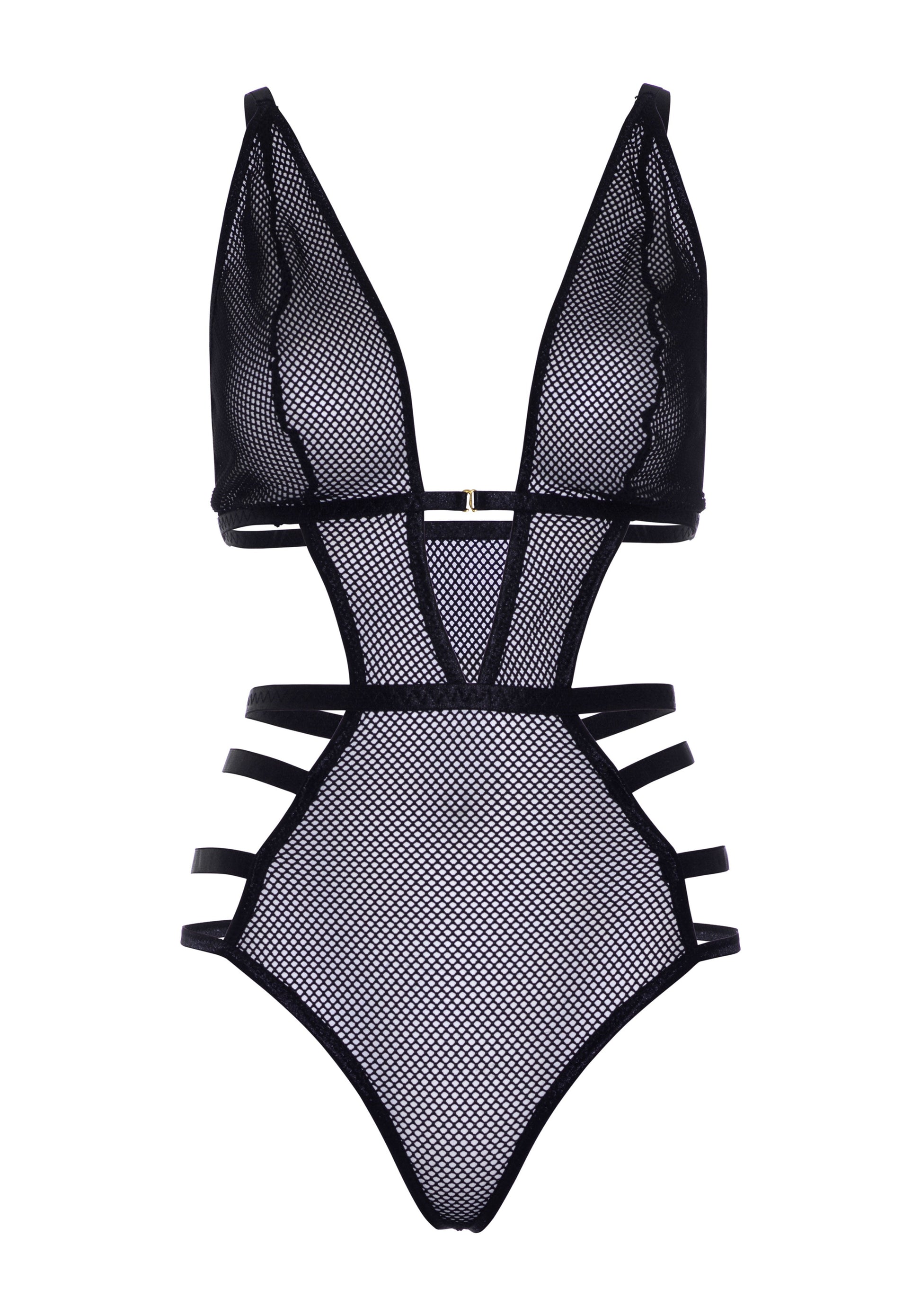 Seduce your sweetie in this fishnet cut-out strappy g-string teddy with adjustable straps. The bodysuit features a strappy bodice with a cut-out design, a plunging deep-v front and a thong panty.