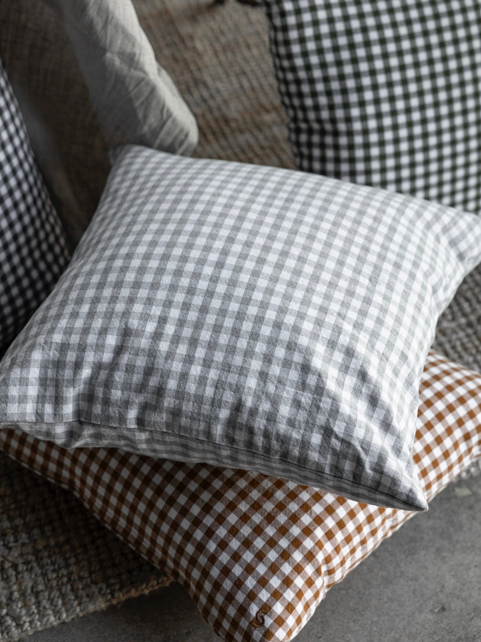 Schlichtes Dekokissen aus recycelter Baumwolle und Kunstfaser mit einem kleinem Karomuster. Leicht körnige Oberfläche. Mit verdecktem Reißverschluss gearbeitet.