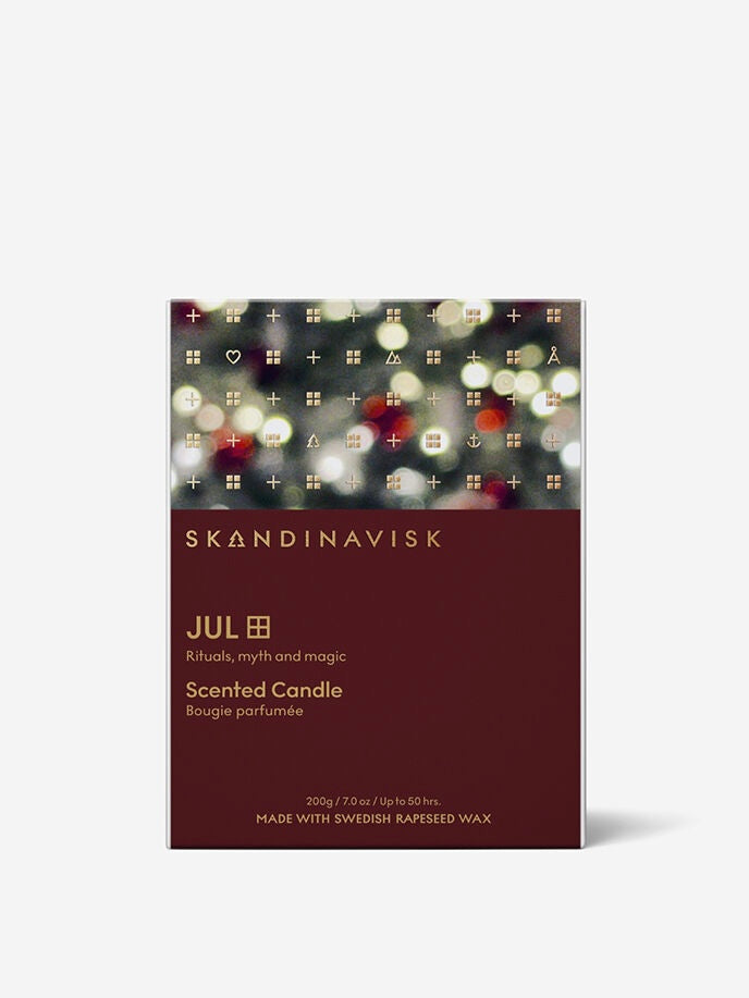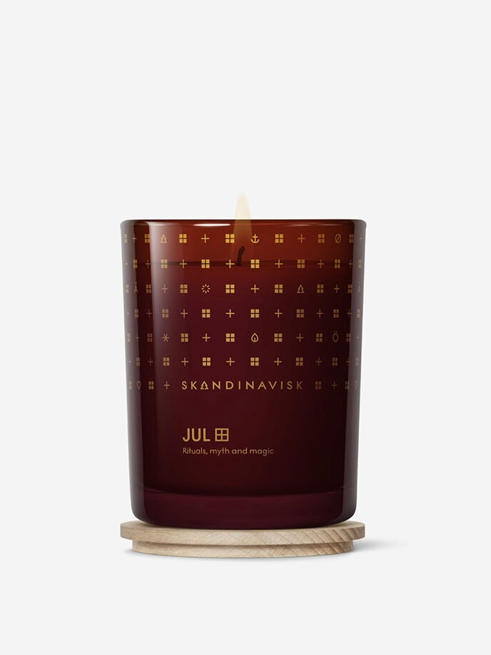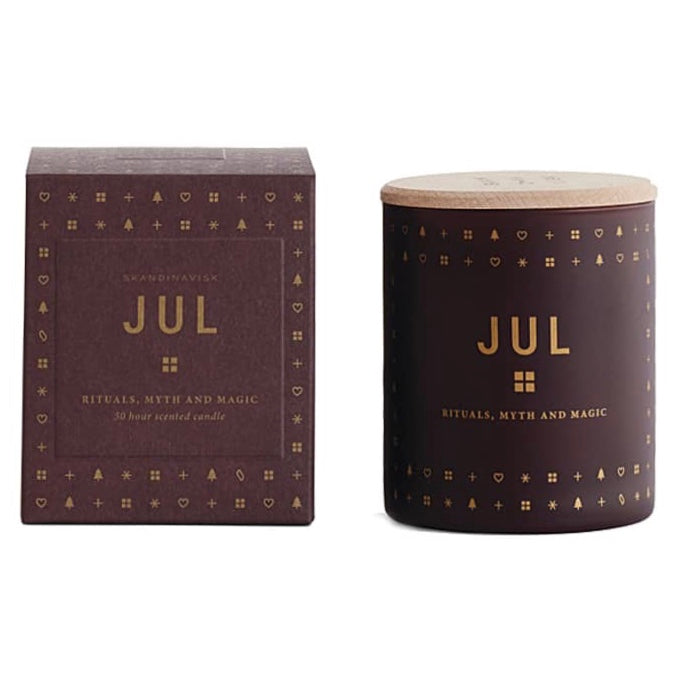 Duftkerze aus pflanzlichem Wachs mit Baumwolldocht und mit natürlichen Geruchsstoffen. Würzige Duftnoten von Lebkuchen, Glühwein und Nelken im dekorativen, bemalten Glasgefäß mit Buchenholzdeckel. Dekorative Verpackung, ideal auch zum Verschenken.