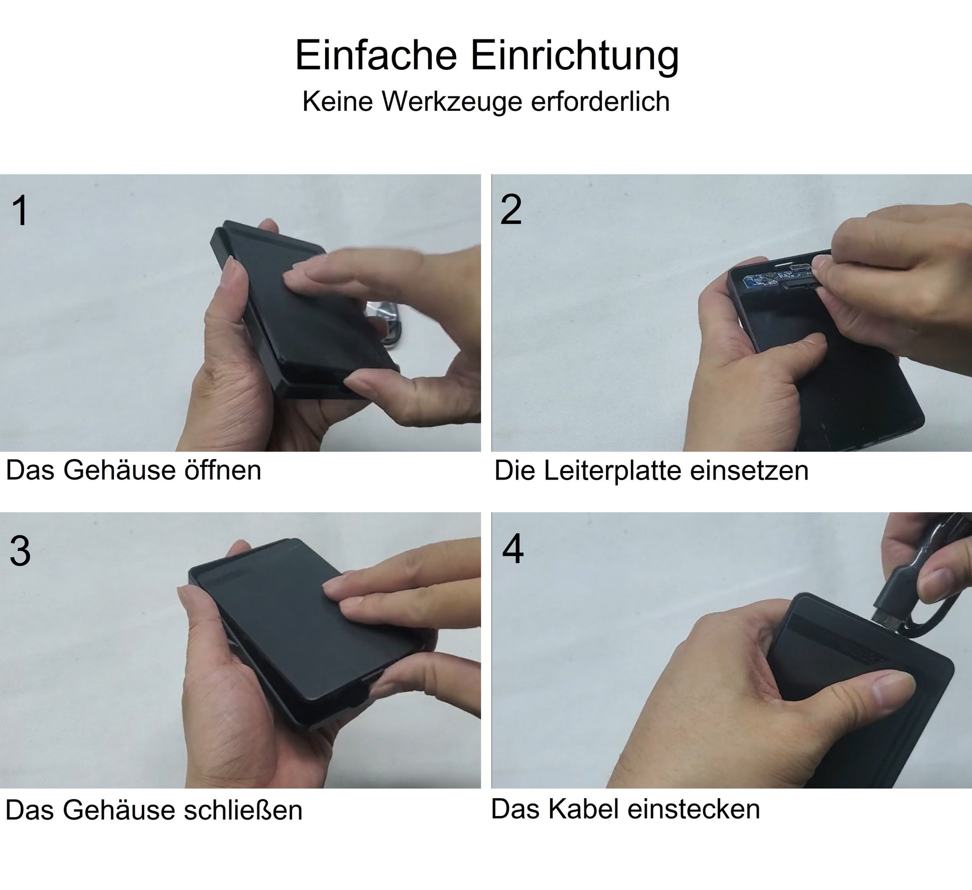 - Hinweis: Die interne Leiterplatte wurde absichtlich nicht fest montiert, um Ihnen mehr Flexibilität beim Anschließen Ihrer Festplatte zu bieten. Wenn das Produkt mit einer losen Leiterplatte geliefert wurde, können Sie den USB-Anschluss einfach an der entsprechenden Öffnung im Gehäuse ausrichten und dann leicht andrücken, um die Leiterplatte zu platzieren (siehe Angebotsbilder)