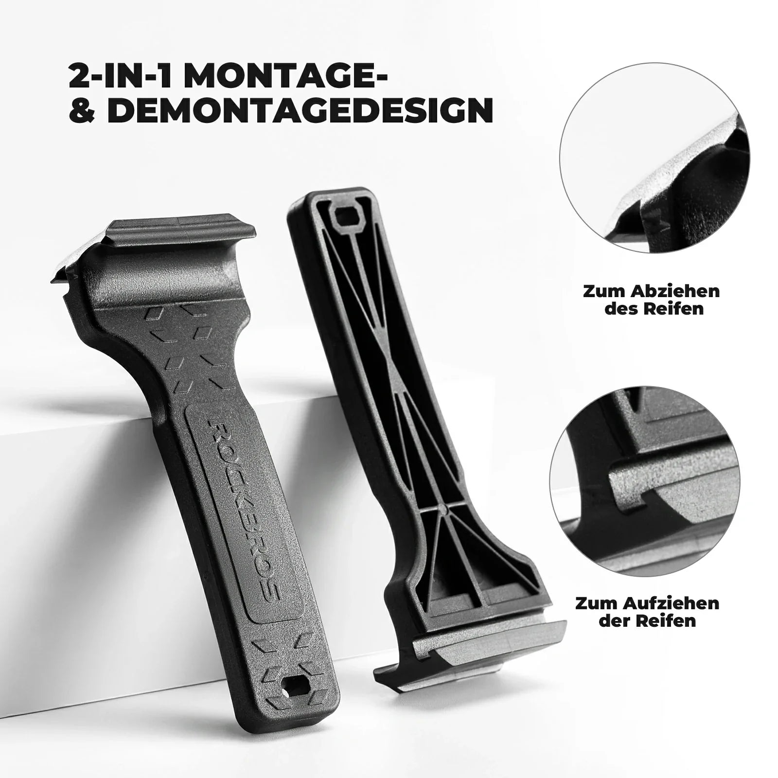 Multifunctional tool for easily mounting and removing bicycle tires. Perfectly suited for city commuters, mountain bikers, and road cyclists.