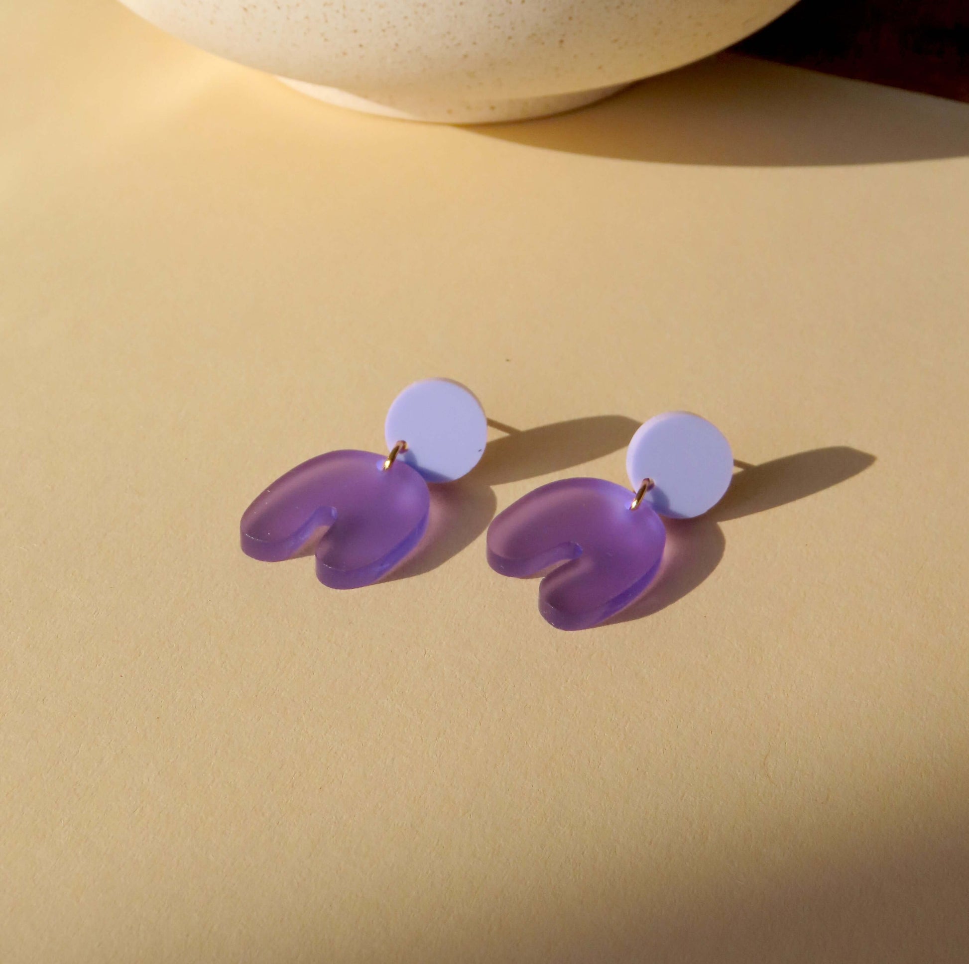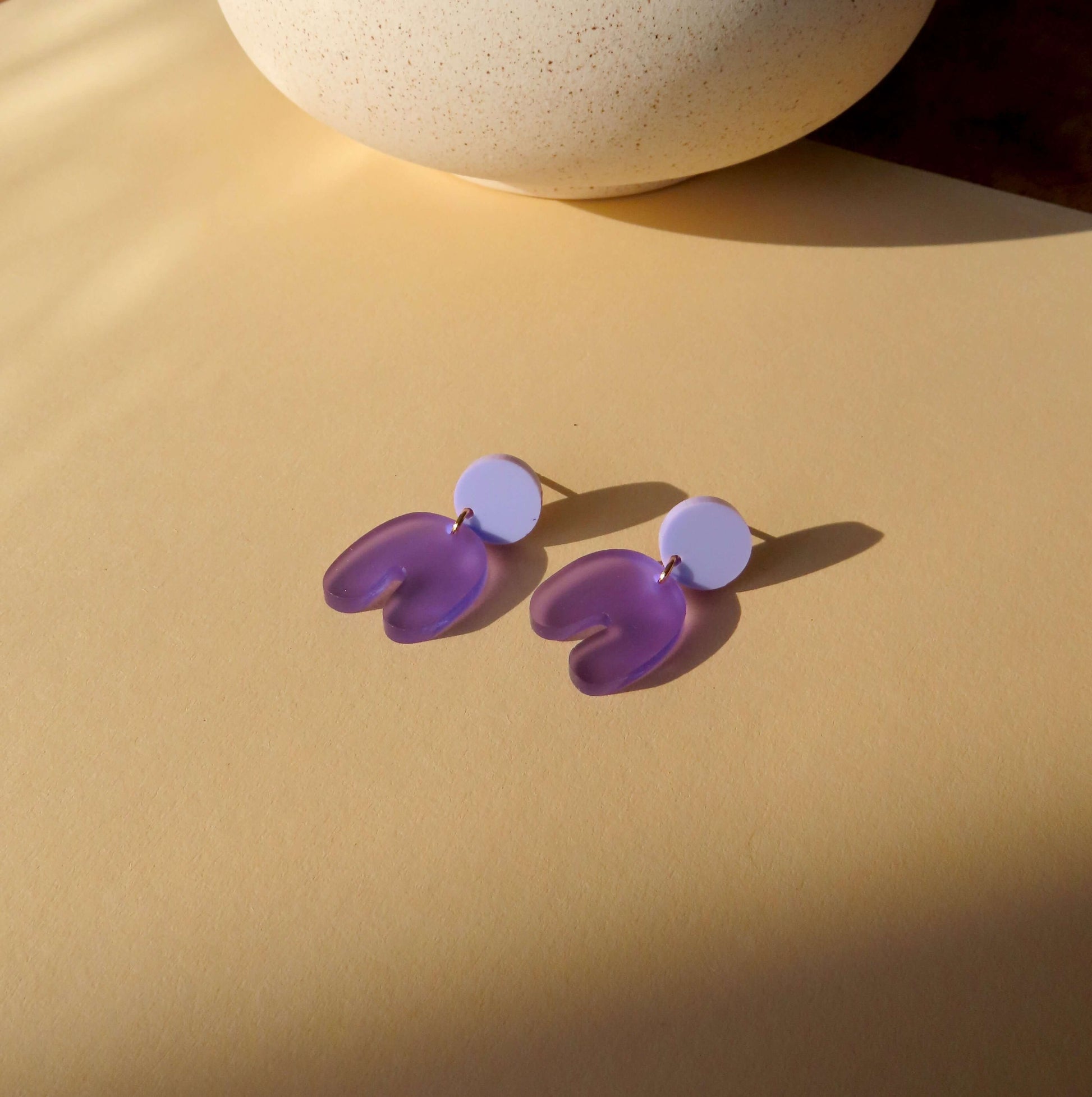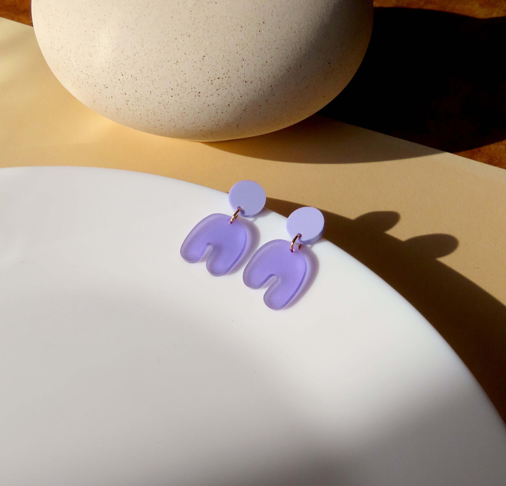 The round stud in a subtle, matte lilac shade picks up the color of the pendant, creating a harmonious overall look. Acrylic makes the earrings wonderfully lightweight, while the stainless steel studs ensure comfortable, skin-friendly wear—perfect for those who love clean shapes and soft colors.