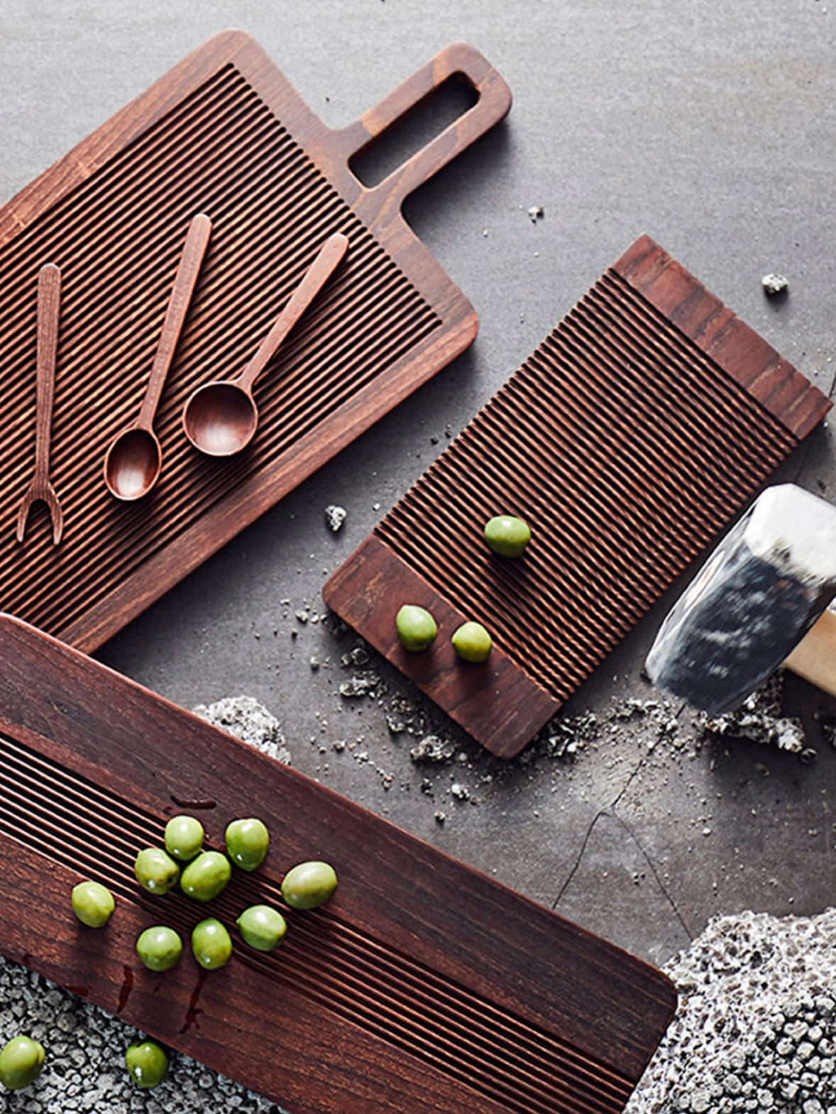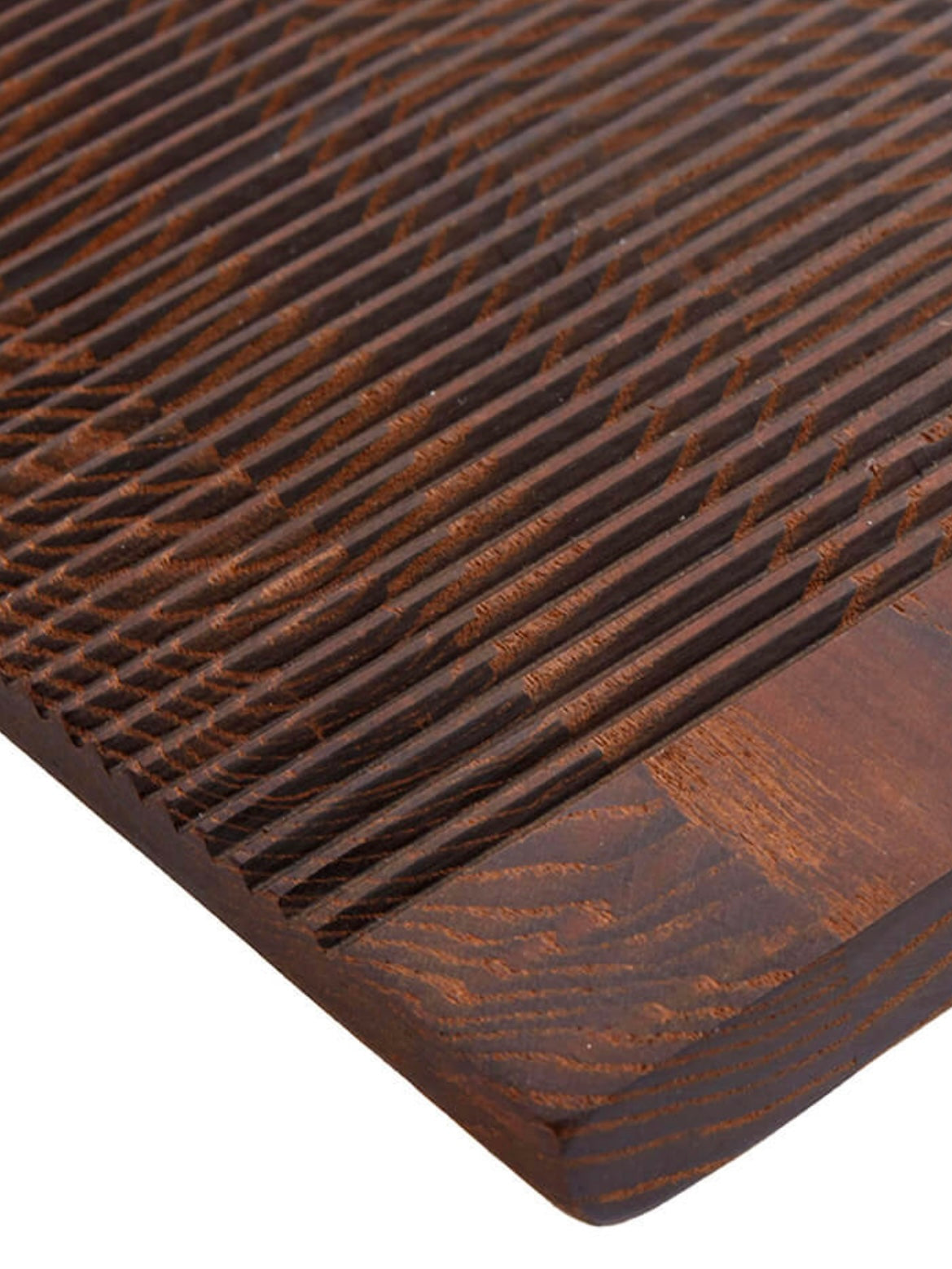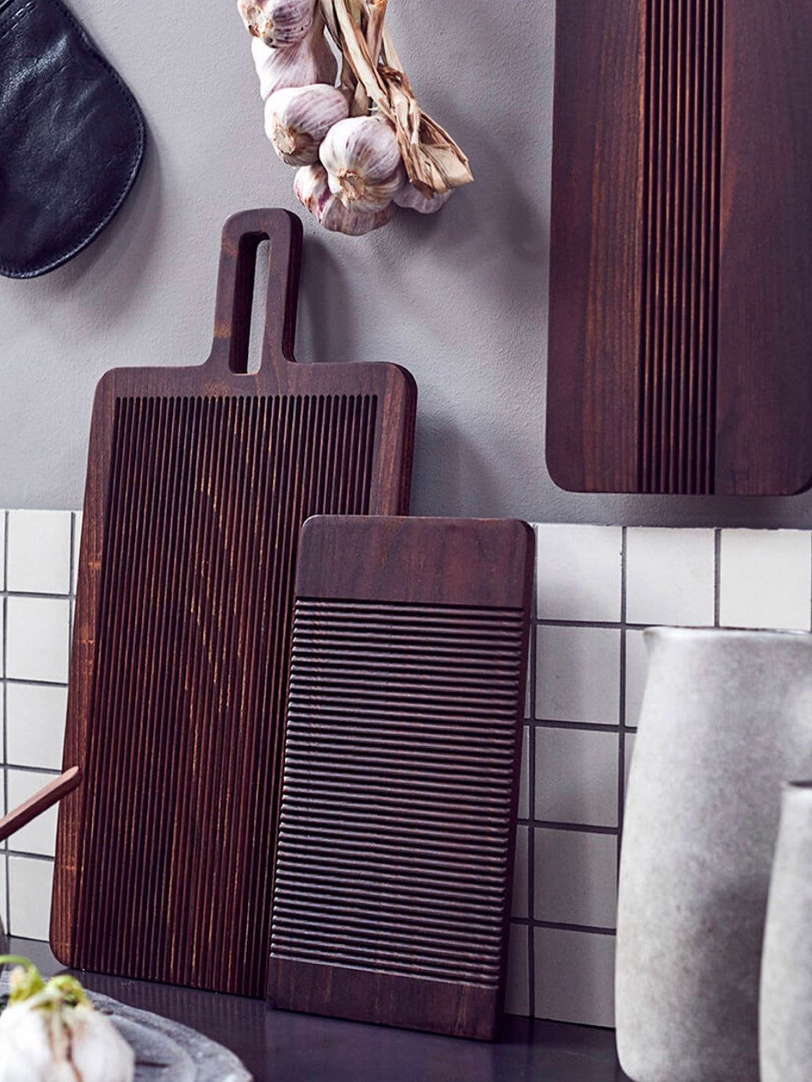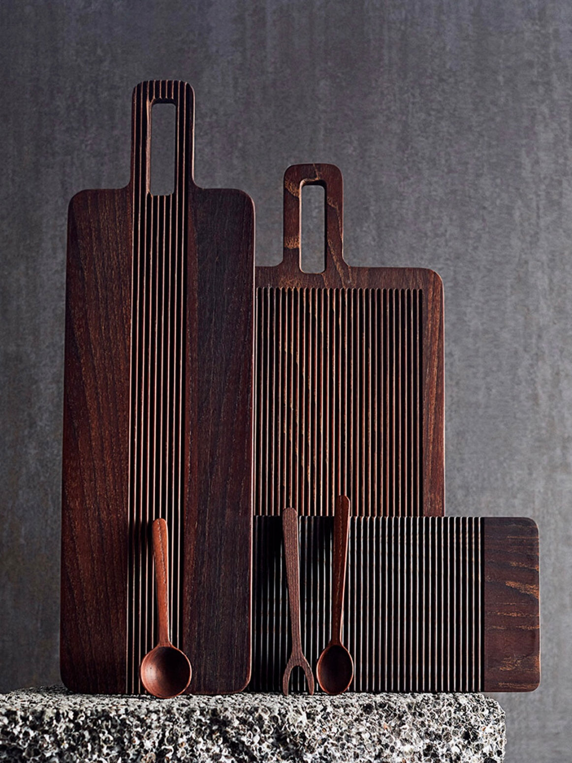 Das Yami-Frühstücksbrett ist Teil der Yami-Küchenkollektion aus karbonisiertem Eschenholz.
