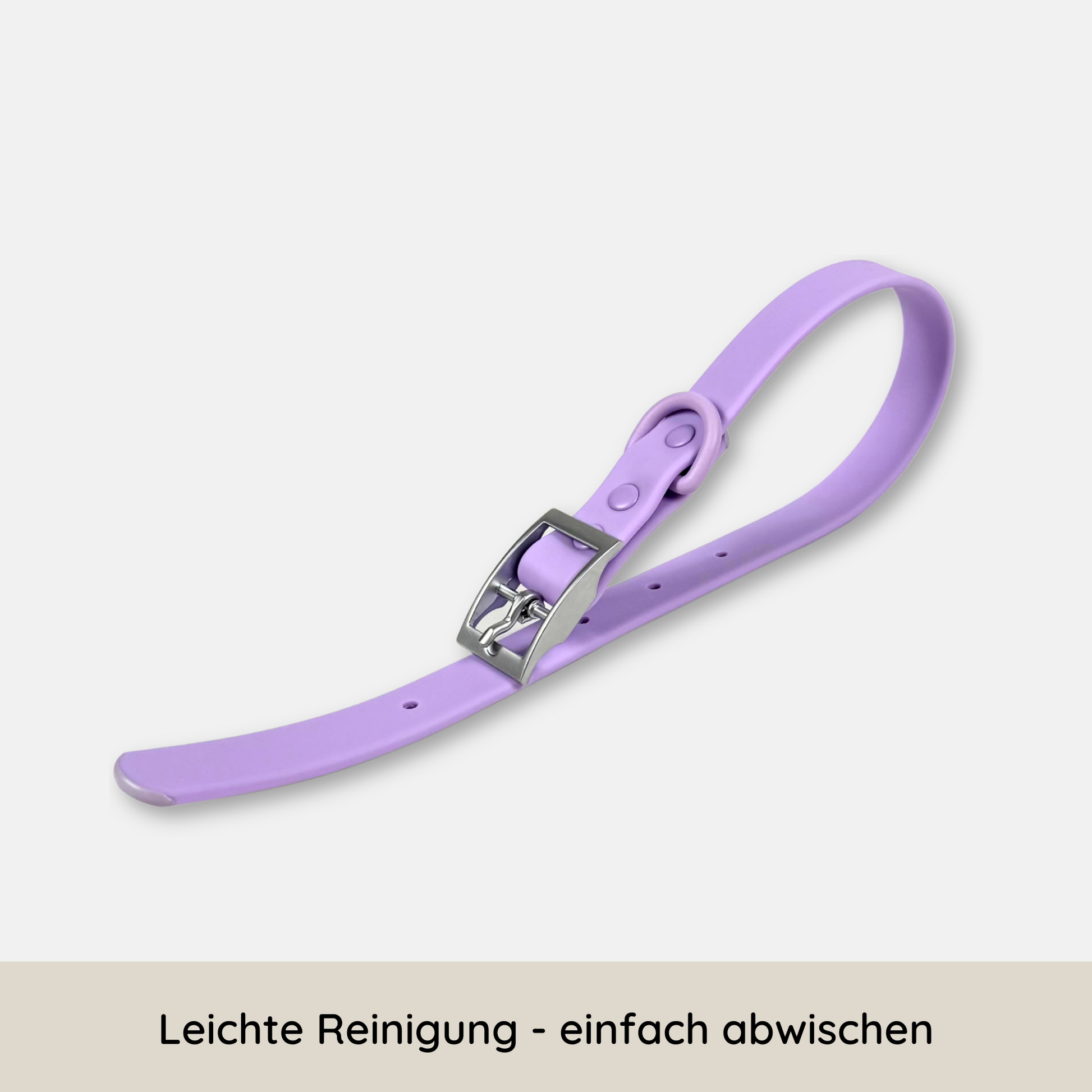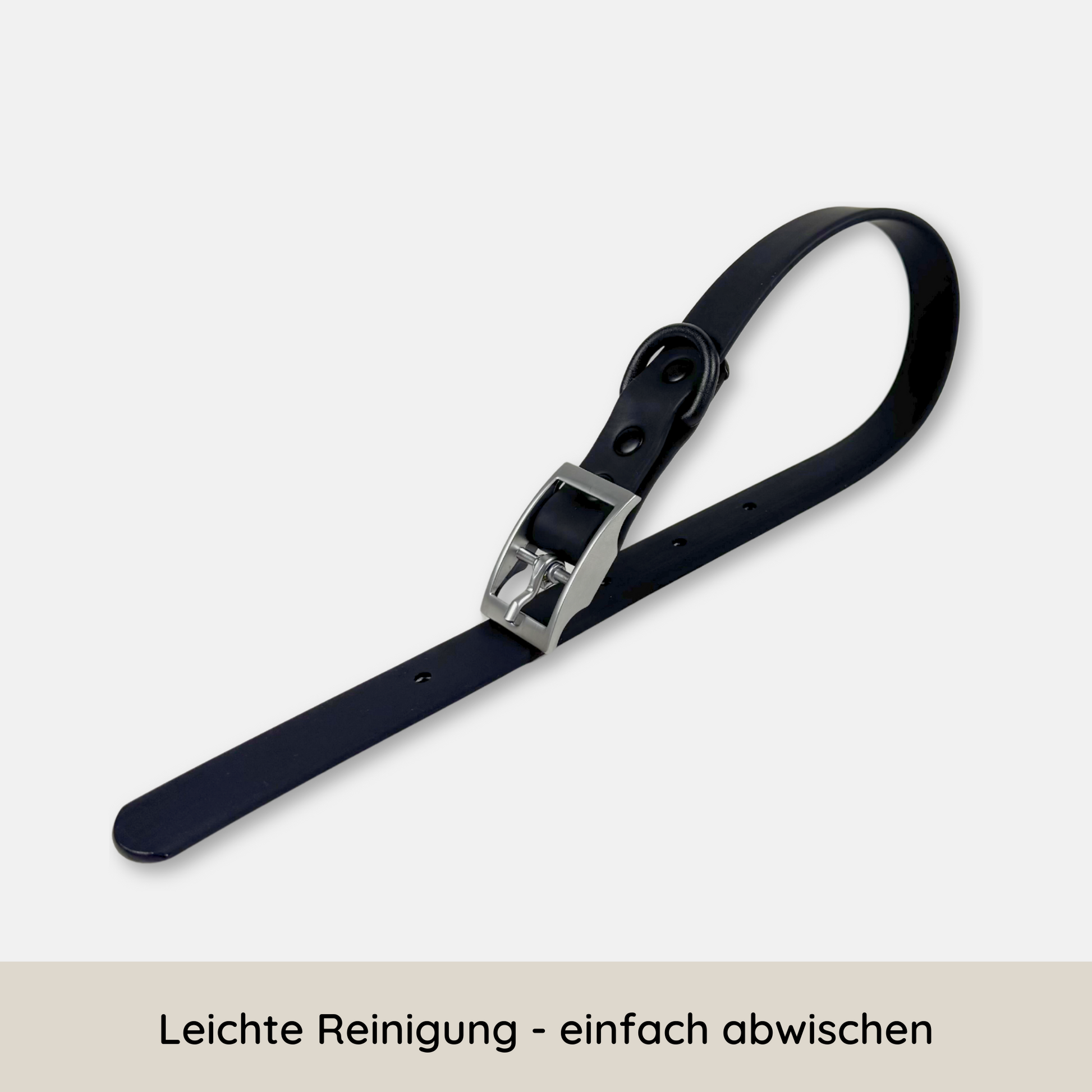 Das weiche, flexible Material mit abgerundeten Kanten liegt angenehm am Hals und verhindert Scheuern und Druckstellen, während das verstellbare Design eine perfekte Passform und Flexibilität bietet. So bleibt das Halsband auch bei wachsenden Hunden stets bequem und sicher.