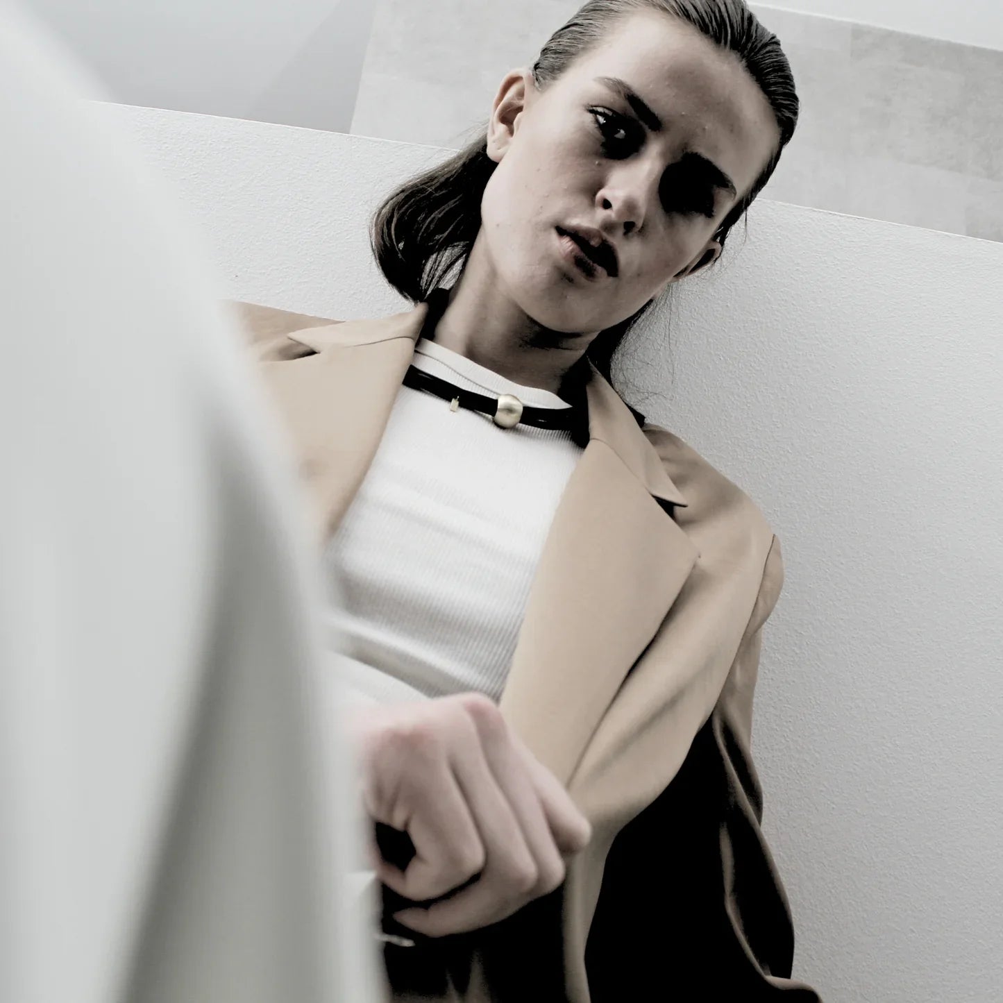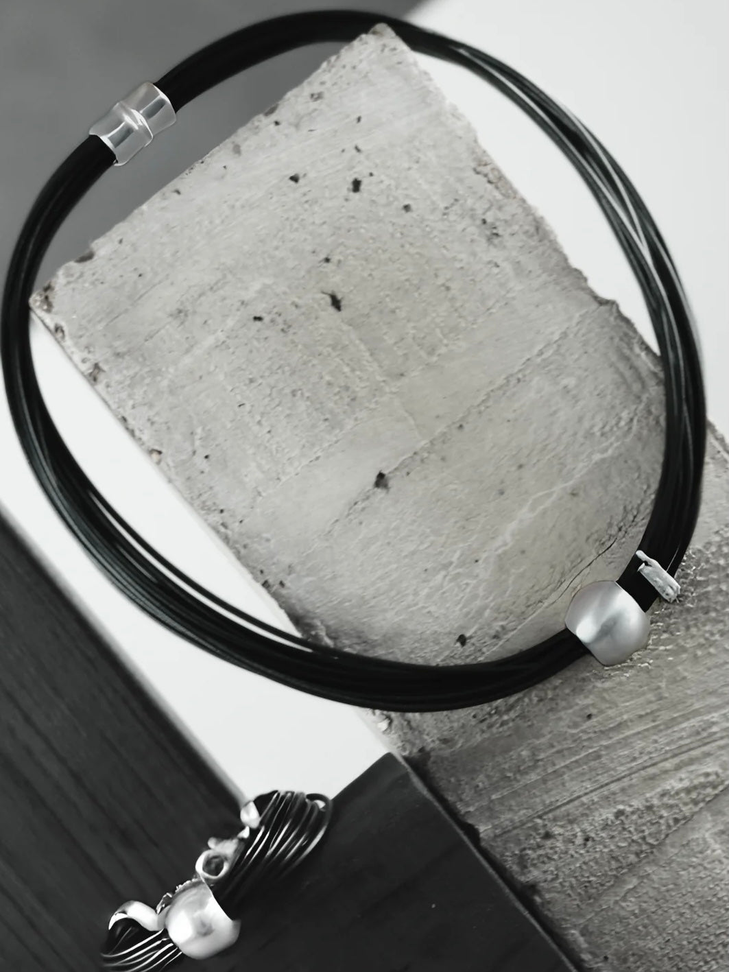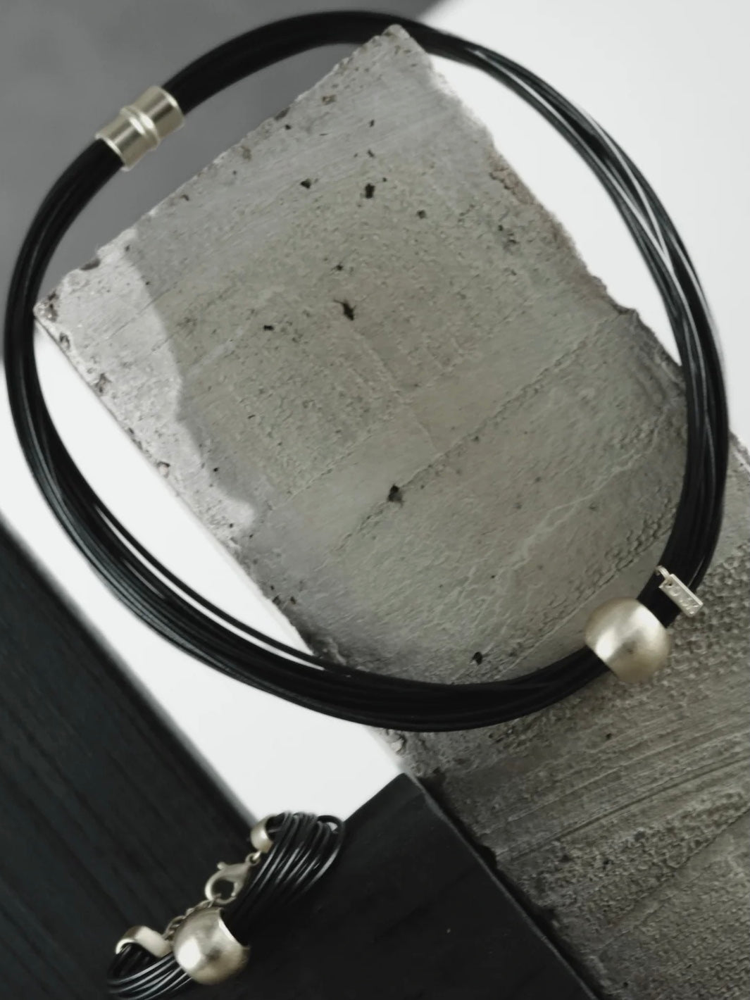 Effektvolle, kurze Halskette aus Leder. Bestehend aus mehreren Bändern, die im vorderen Teil mit einem Ring aus versilberten oder vergoldeten Messing verziert sind. Mit Verlängerungskettchen und Magnetverschluss.