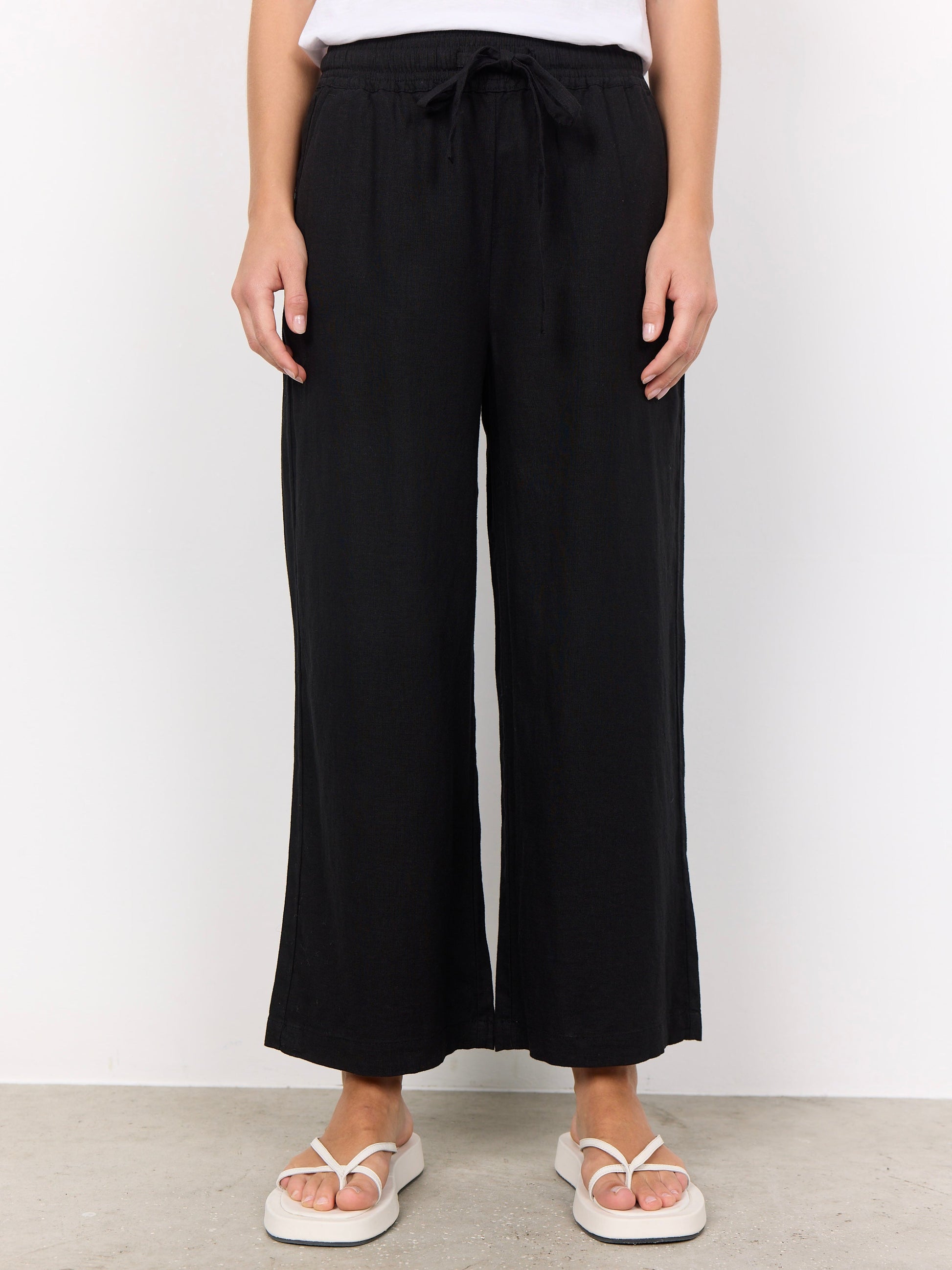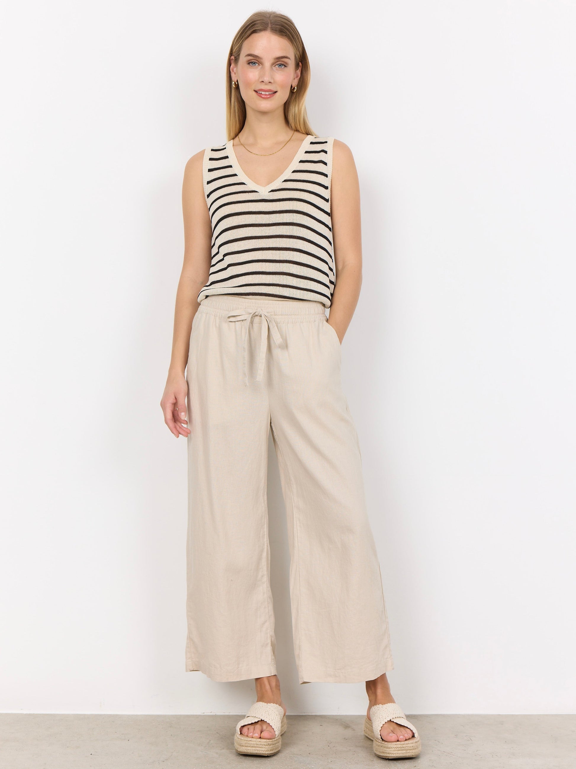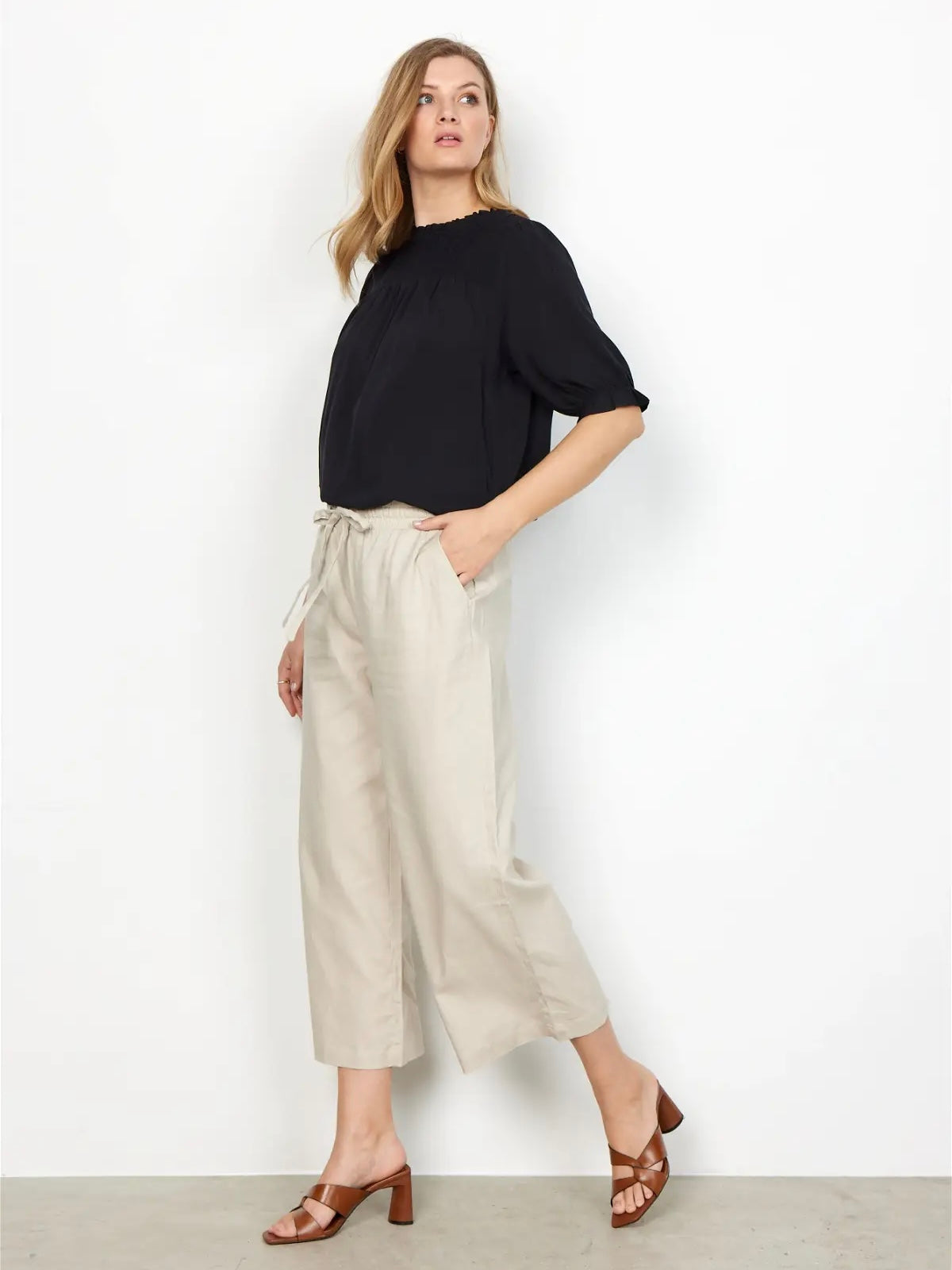 Lässige Hose im Palazzo Stil mit weiten Beinen in 7/8Länge. Sommerliche Leinen/Viskosequalität. Seitliche Eingrifftaschen und angesetztes glattes Bündchen mit Gummizug und Bindeband. Sowohl in der Freizeit als auch ins Büro zu tragen.