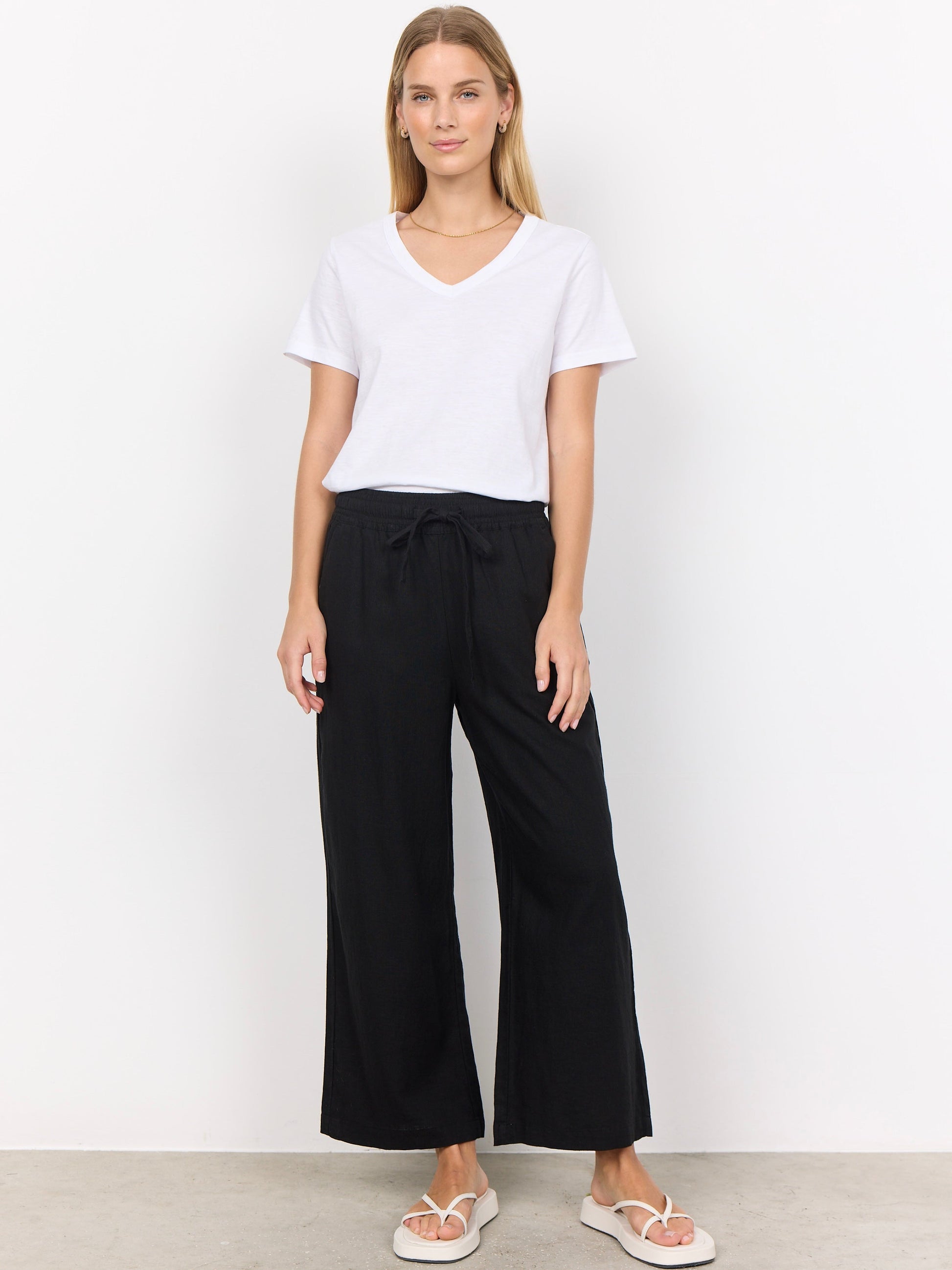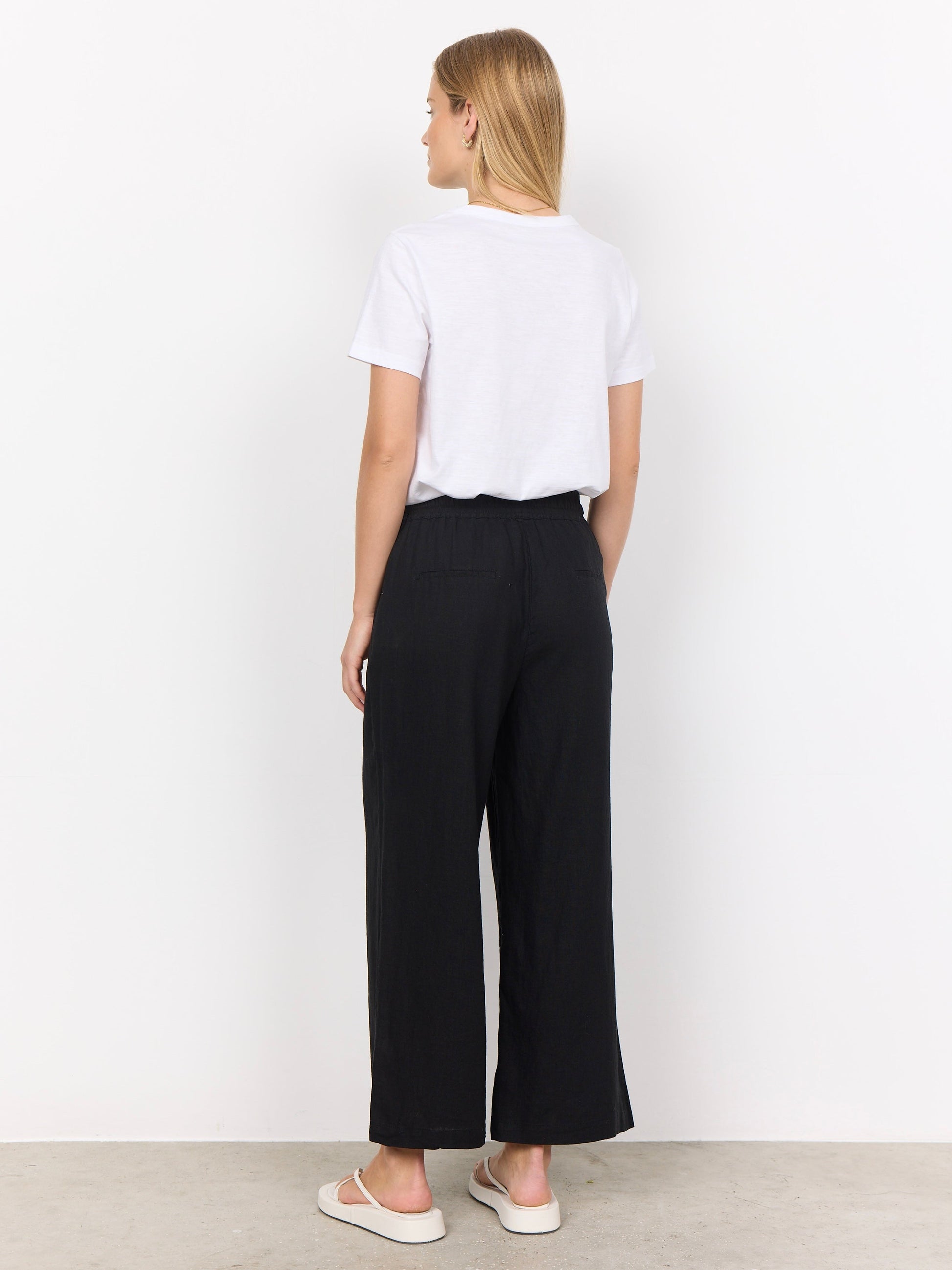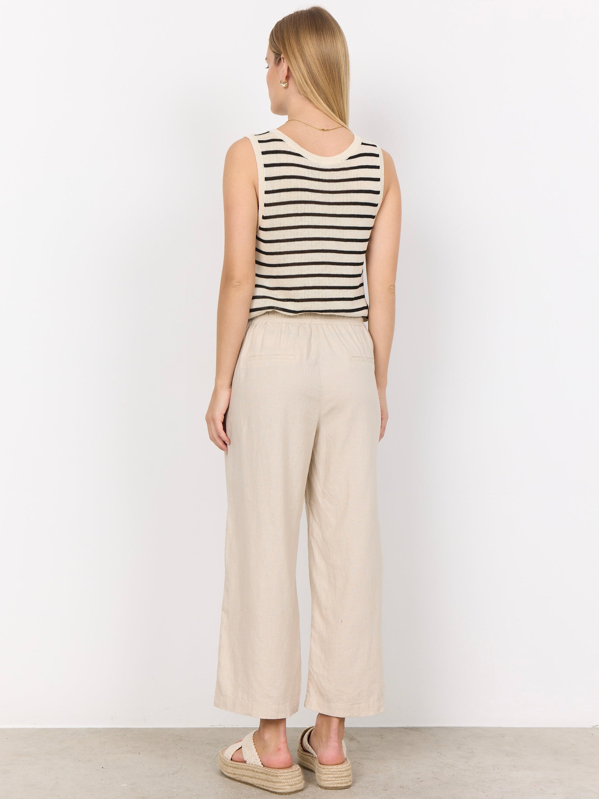 Lässige Hose im Palazzo Stil mit weiten Beinen in 7/8Länge. Sommerliche Leinen/Viskosequalität. Seitliche Eingrifftaschen und angesetztes glattes Bündchen mit Gummizug und Bindeband. Sowohl in der Freizeit als auch ins Büro zu tragen.