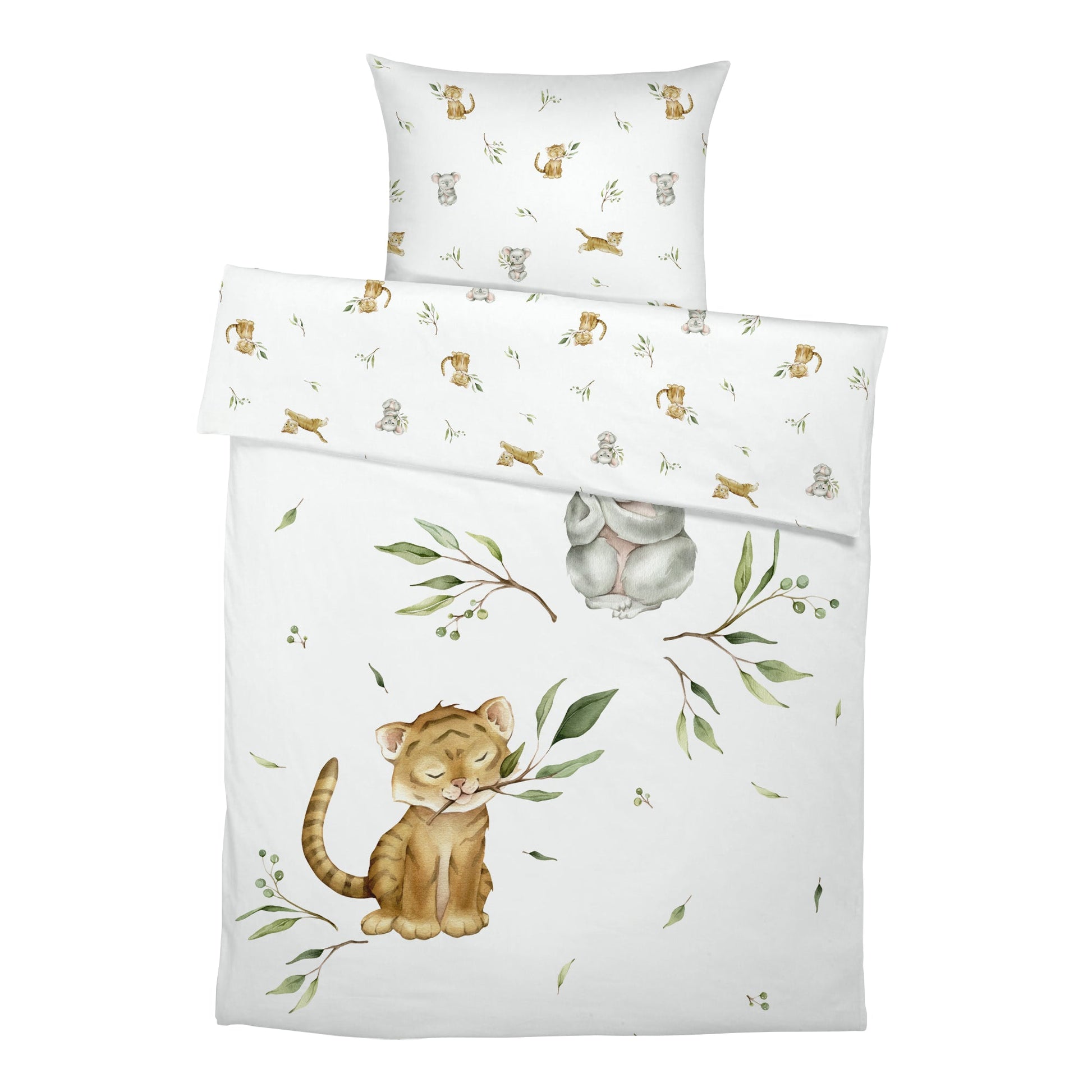 A delightful adventure: Immerse yourself in a magical world where friendly tigers and koalas live among soft eucalyptus leaves. This lovingly designed bedding, made from pure cotton, creates a cozy sleeping environment and ensures a pleasant sleeping climate. The detailed design with its playful animals invites you to snug nights and imaginative dreams. Ideal for little animal lovers and curious explorers!
