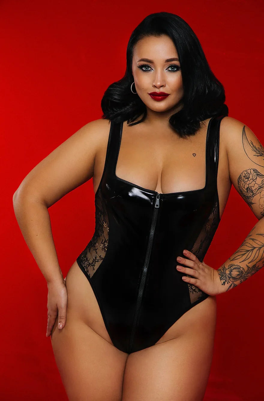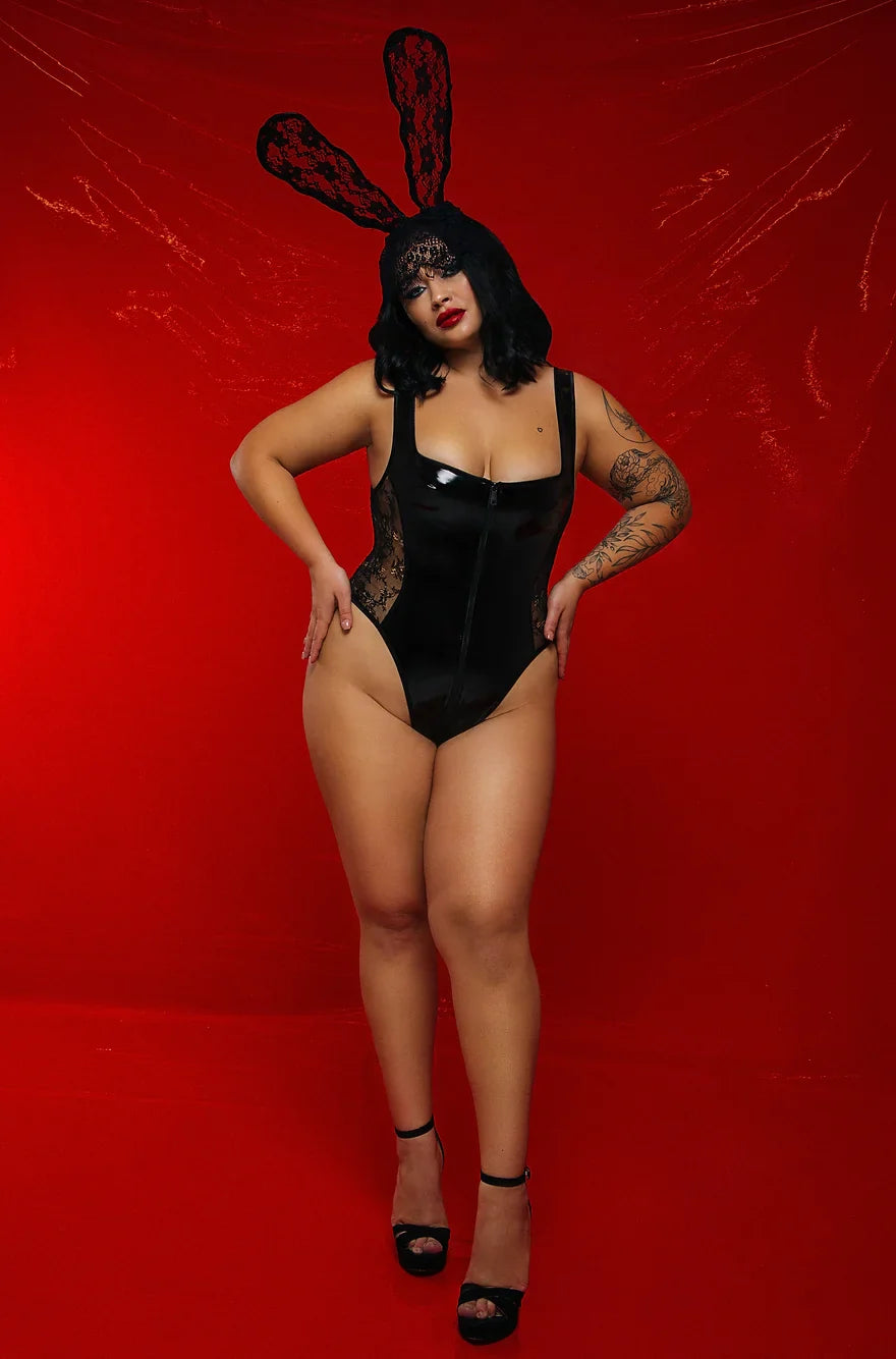 Entdecken Sie den "Lace Detailed Vinyl Set" - ein gewagtes Ensemble, das Ihre sinnliche Seite in den Vordergrund stellt. Dieses verführerische Outfit kombiniert die kühne Ästhetik von schwarzem Vinyl mit zarten Spitzendetails, die an den Seiten eingearbeitet sind. Der durchgehende Reißverschluss führt von der Brust bis zum unteren Rücken und ermöglicht ein unkompliziertes An- und Ausziehen. Ein verspielter, weißer, flauschiger Bunny-Schwanz ziert das Unterteil und verleiht dem Outfit einen koketten Touch.