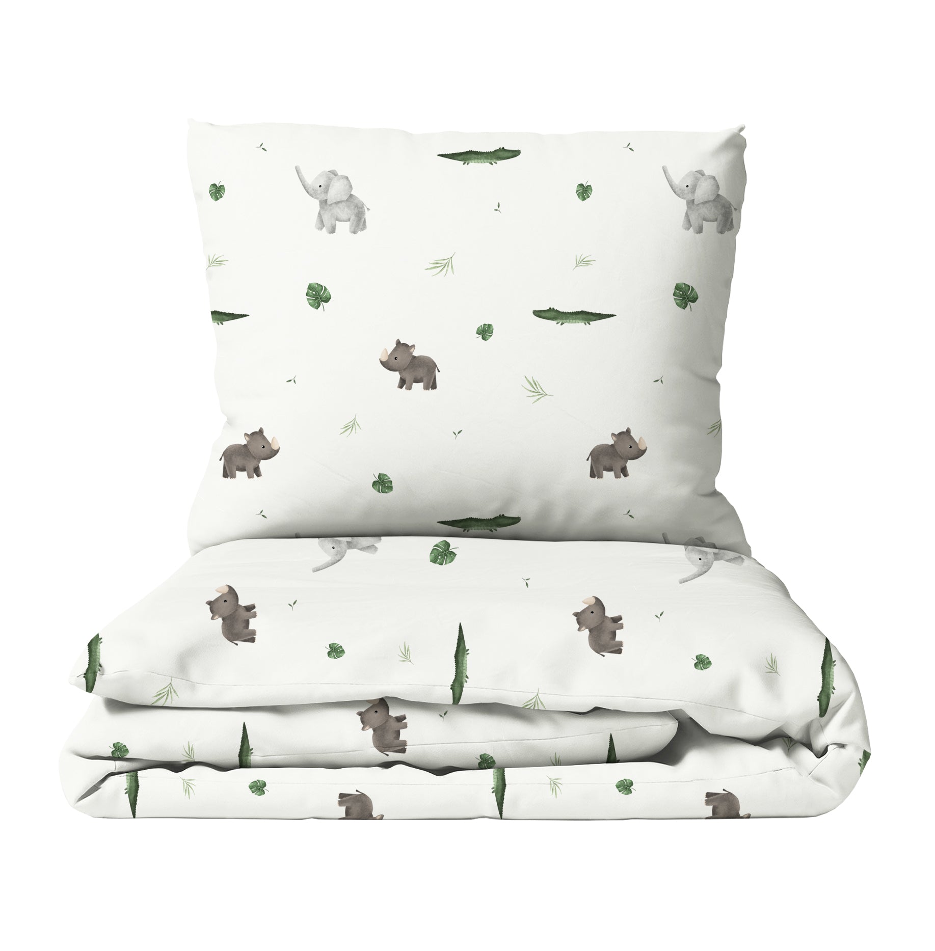 With our "Little Safari" design, bedtime becomes an expedition to the heart of Africa. Gentle watercolor illustrations of little elephants and rhinos, surrounded by tropical foliage, create a calming yet imaginative atmosphere in the children's room.