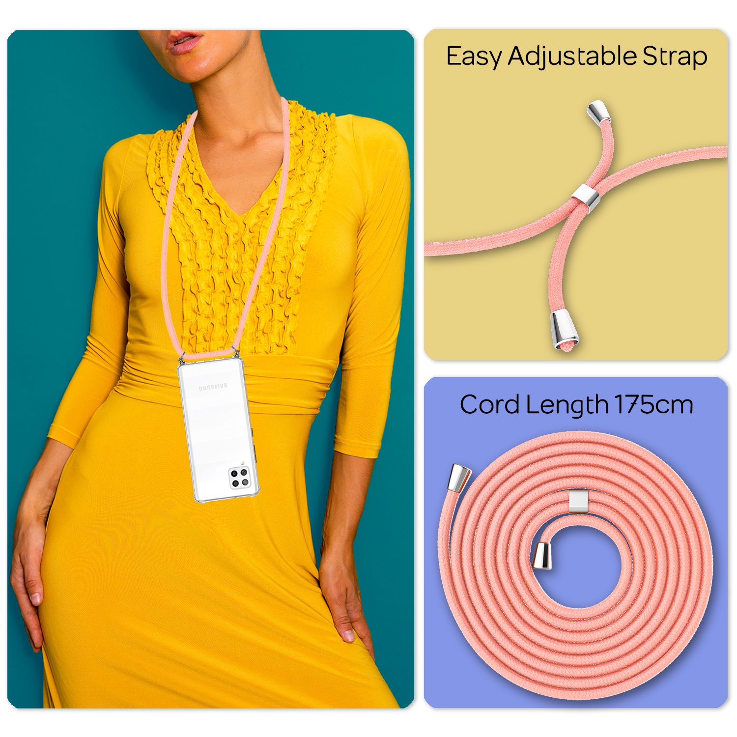 The 150 cm long phone strap is comfortable to wear and extra resistant to tangling. You can wear your smartphone flexibly over your shoulder, around your neck, or crossbody – whichever suits you best.