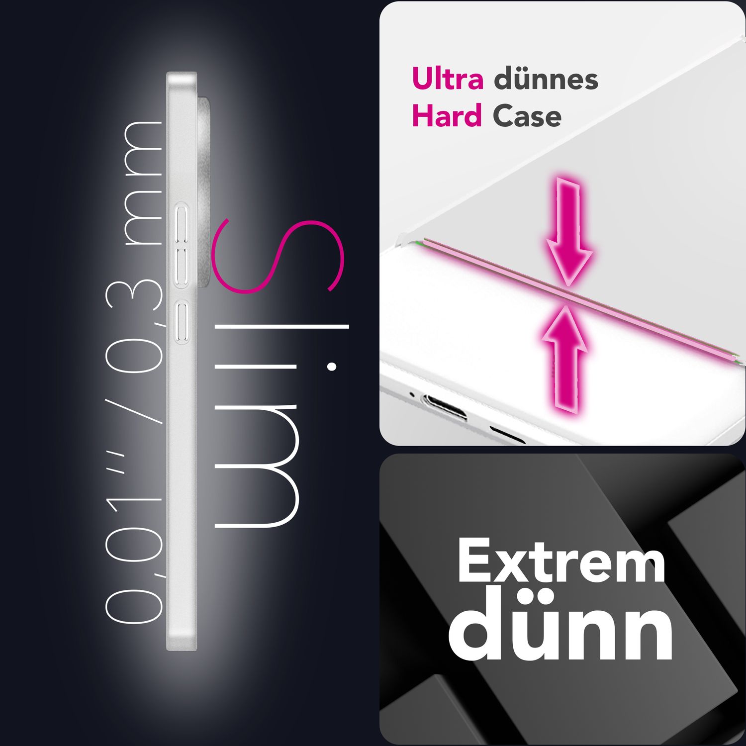 The Phantom case combines minimalist design with reliable protection . At only 0.3 mm thick, your smartphone remains feather-light and slim – almost like having no case at all!