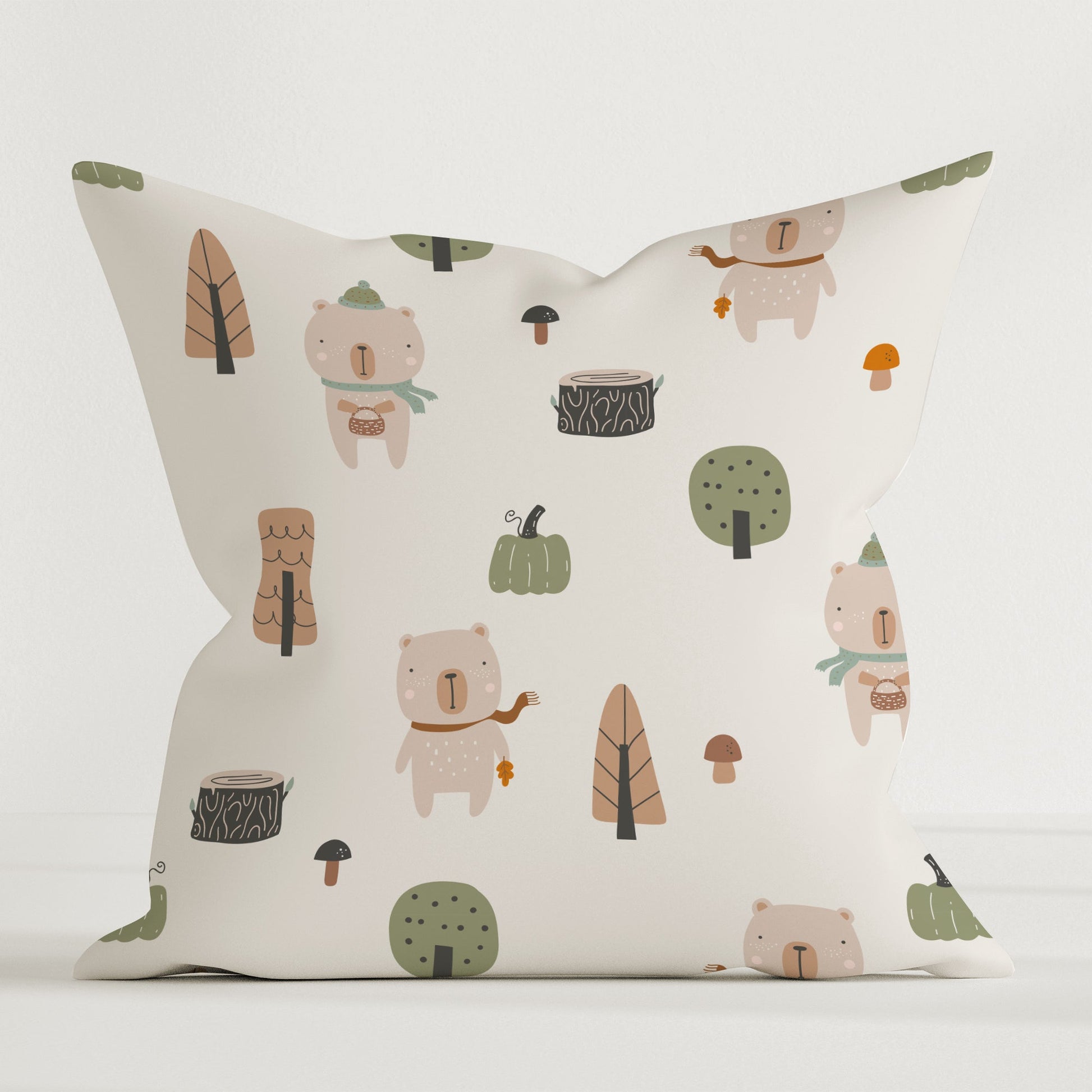 Autumnal coziness: The "Nordic Bear" design on this decorative cushion transports your child to an autumnal forest landscape where a little bear plays among colorful trees. The warm colors and the friendly bear create a comfortable and calming atmosphere, perfect for cuddling and dreaming.