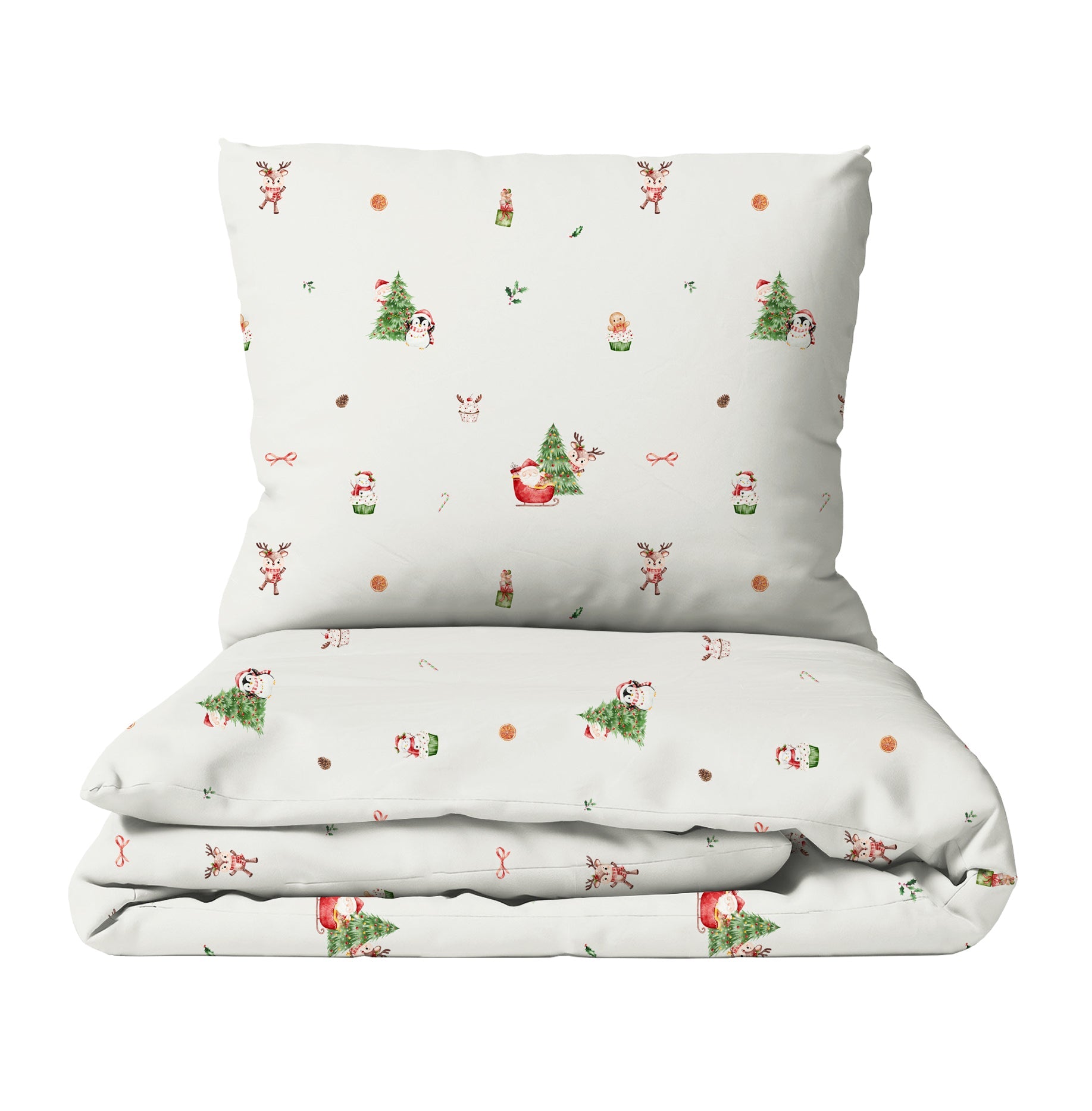 Nordic Winter Wonderland: This Scandinavian design brings a magical Christmas world to life. Little Santas, festively decorated Christmas trees, curious deer, and cheerful penguins frolic in a snowy landscape that seems to have sprung from a fairytale book. Every glance at this lovingly illustrated motif invites dreams and exudes the magical charm of the Christmas season. Made from OEKO-TEX 100 certified cotton, this bedding provides cozy comfort and accompanies your child into a world full of joy and winter adventures. Ideal for little explorers who dream of a Nordic Christmas journey!
