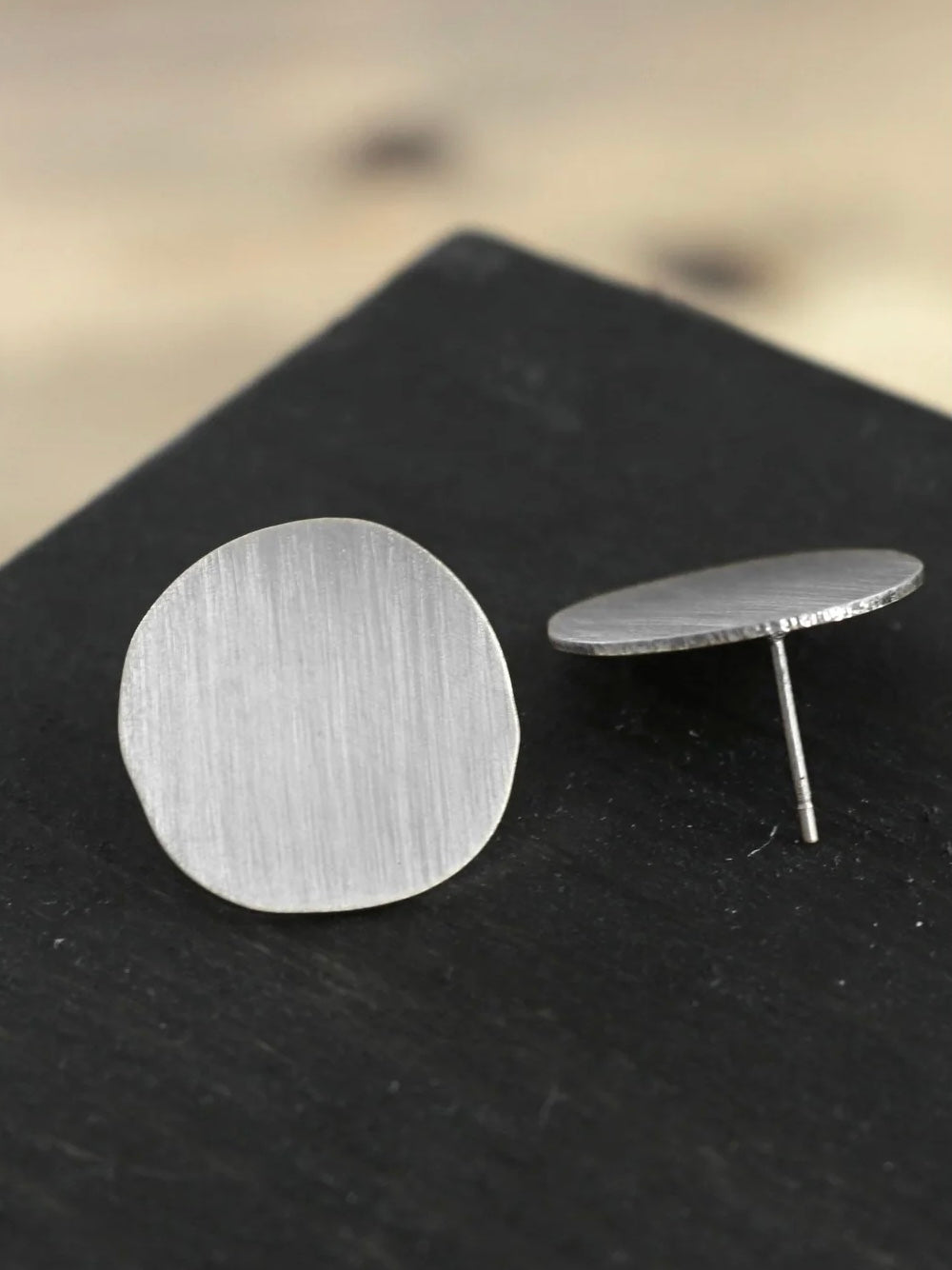 Modische, organisch geformte Ohrstecker aus matt versilbertem oder vergoldeten Messing mit schraffierter Oberfläche.