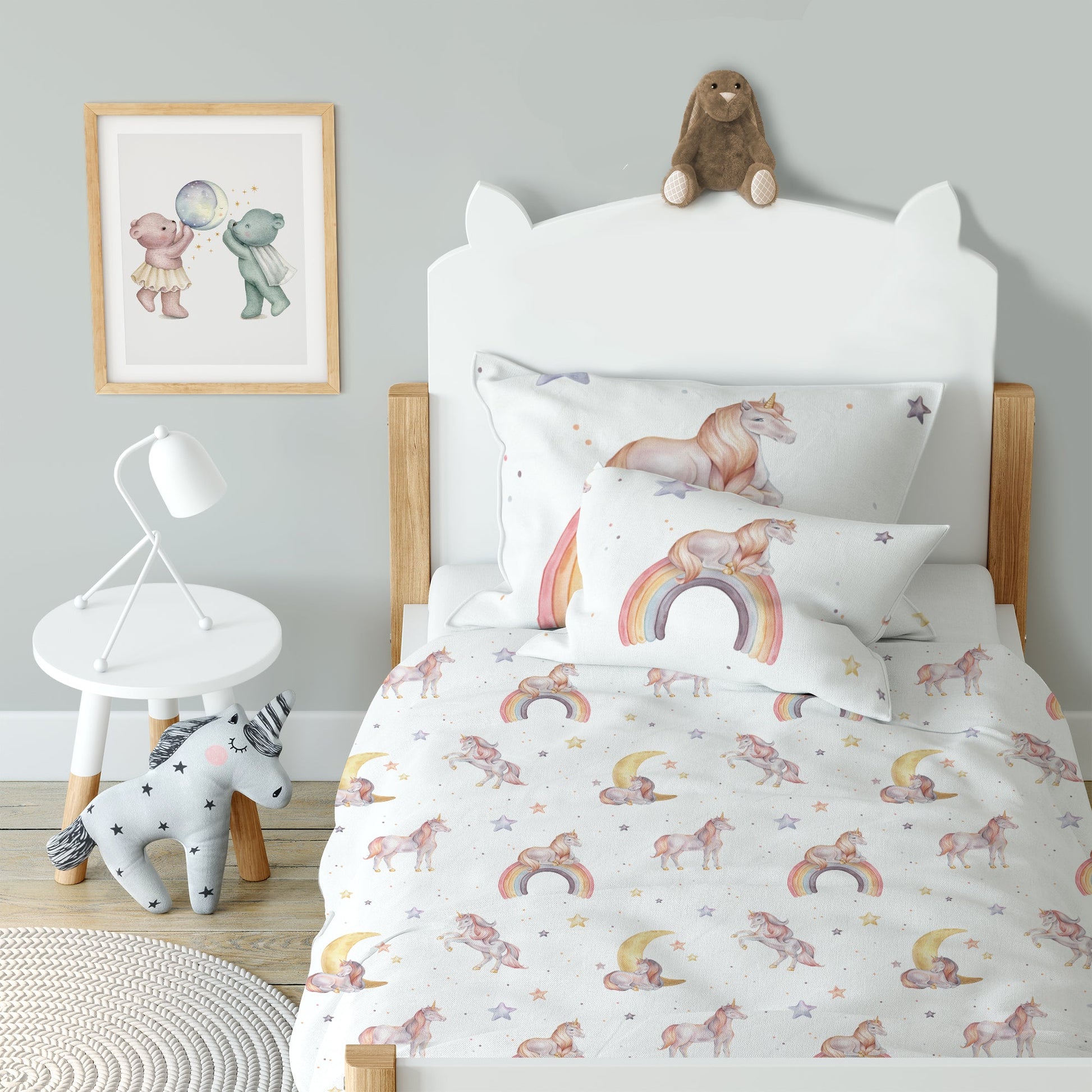 Delicate unicorns, rainbows, and stars bring magic to the children's room. The charming illustrations create enchanting nights and lull little dreamers to sleep peacefully.