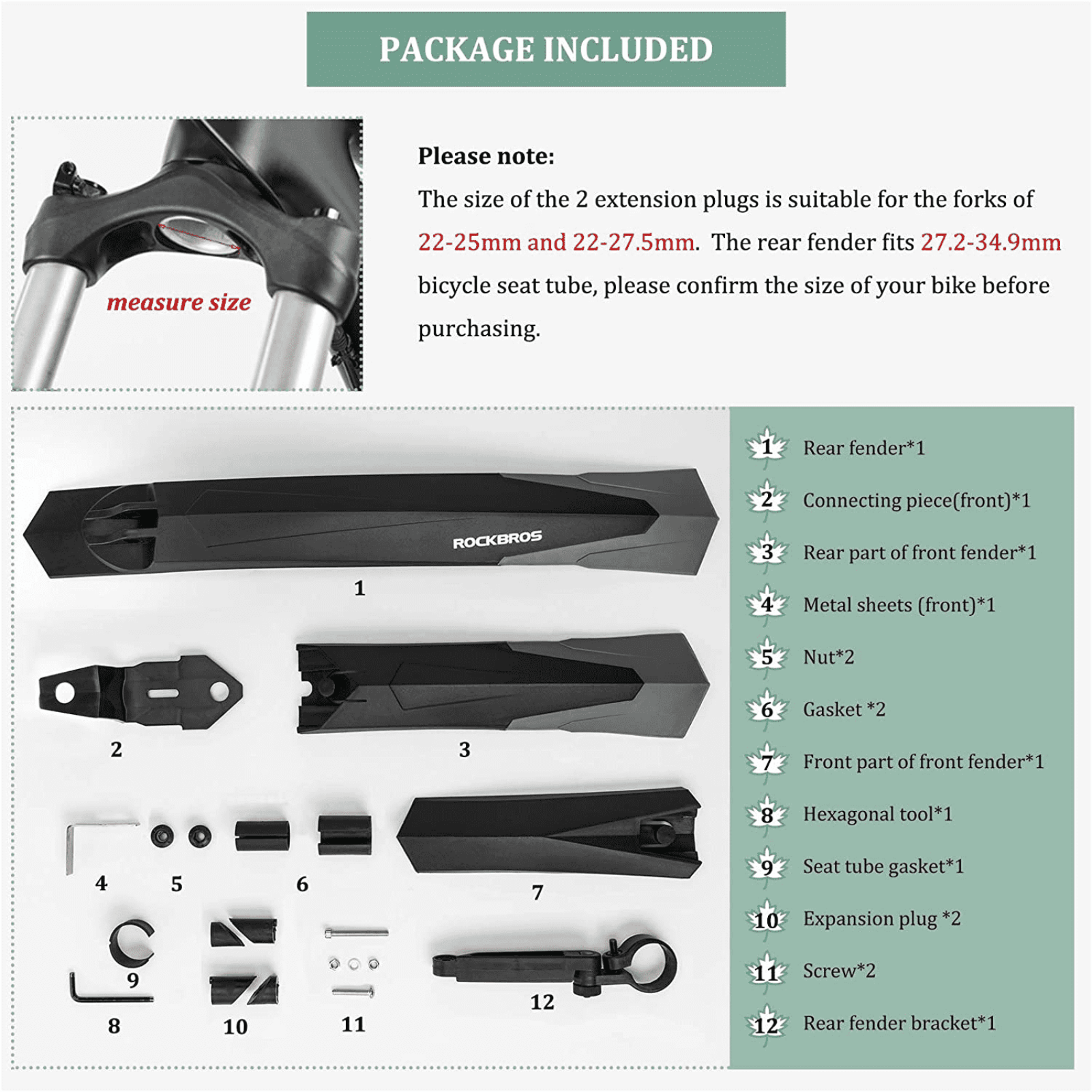 - Easy to install: The package includes 2 mudguards and all necessary mounting hardware. The fork holes should have a diameter of 22-25mm or 22-27.5mm, and the seatpost a diameter of 27.2-34.9mm.