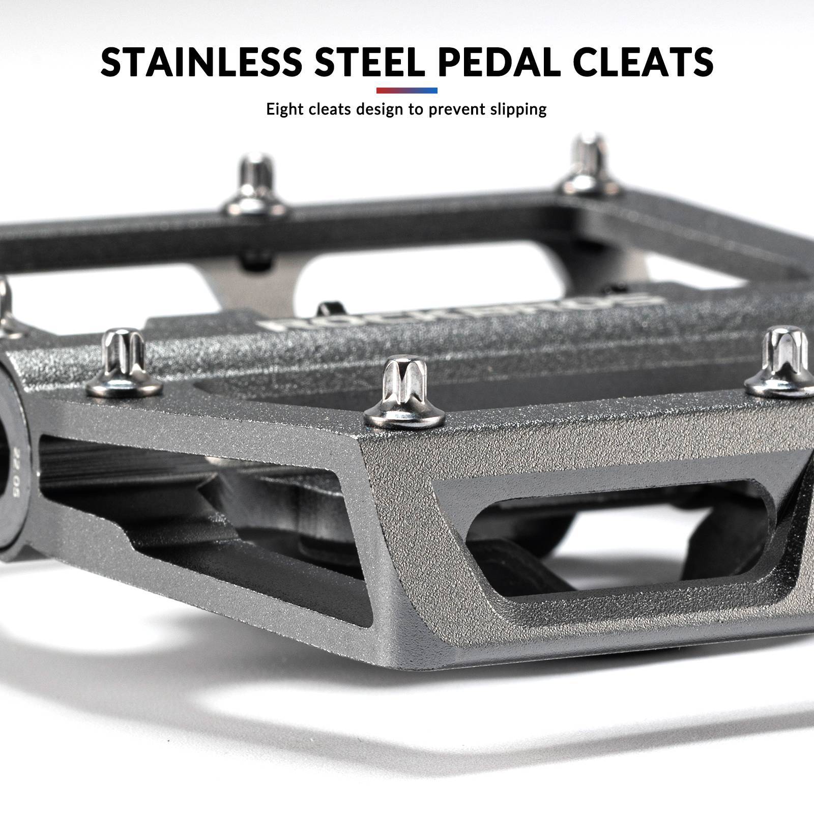 - Anti-slip and super grip: 8 stainless steel spikes on this side of the flat pedal provide additional friction and enough grip to effectively prevent shoes from slipping off the pedal.