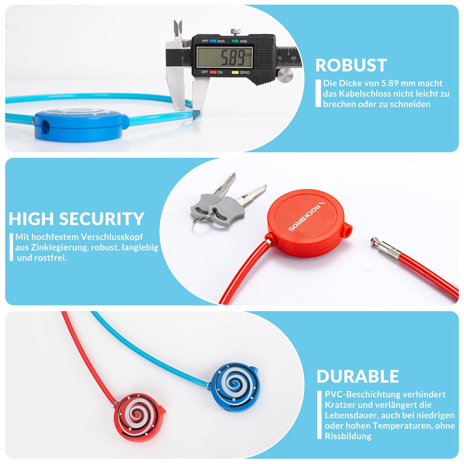 - Secure & Robust: The inside of the bicycle lock is made of steel cables. The 5.89 mm thickness makes the cable lock resistant to breaking or cutting. The PVC protective coating prevents scratches and extends the lock's lifespan. It features a high-strength zinc alloy locking head, making it robust, durable, and rust-resistant.
