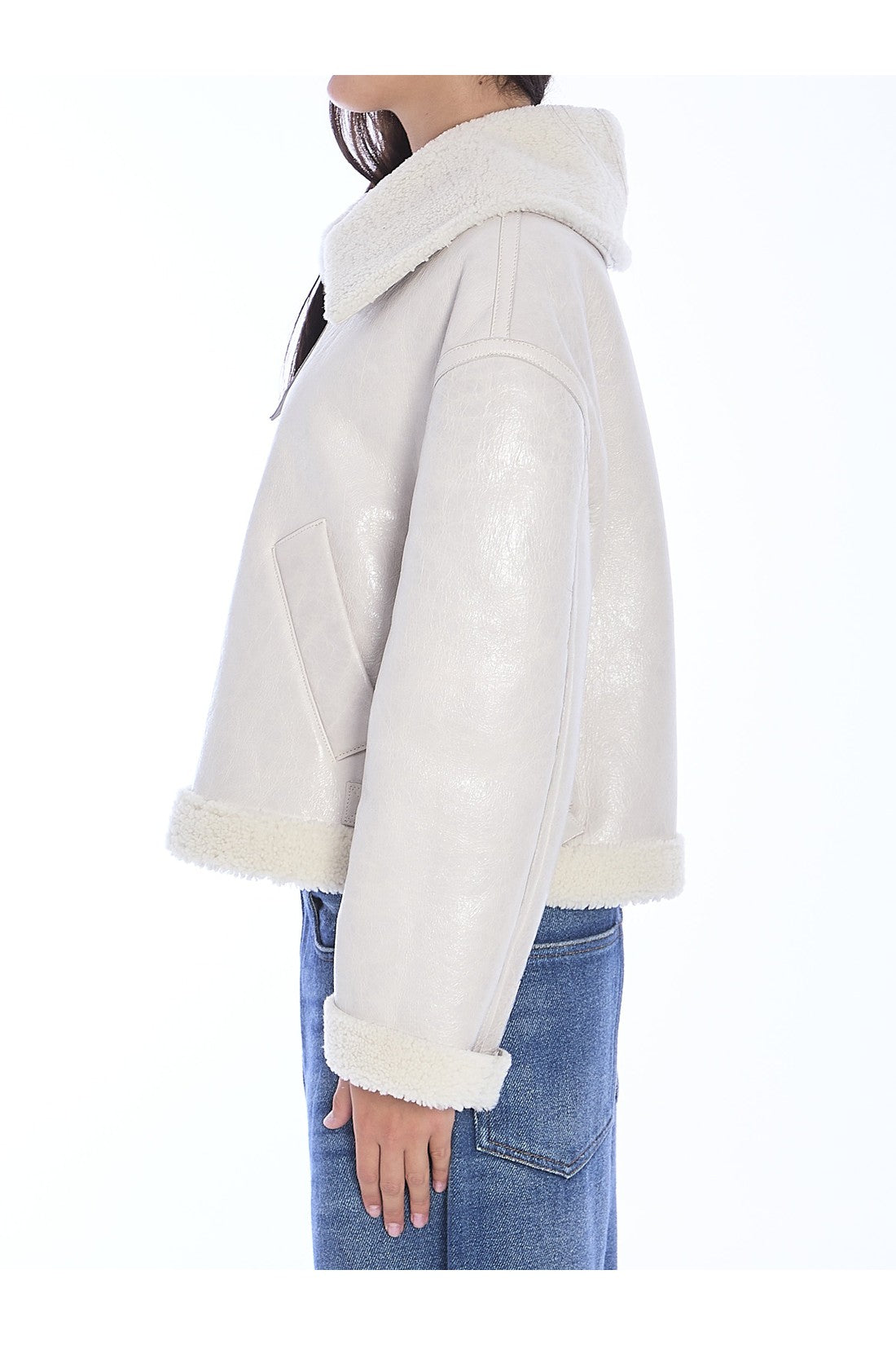 Ivory shiny leather jacket with shearling lining. It features buckle strap on collar, front two-way zip closure and two side welt pockets. Regular fit. Any leather imperfections are not to be considered manufacturing defects, but a peculiarity of the material.
