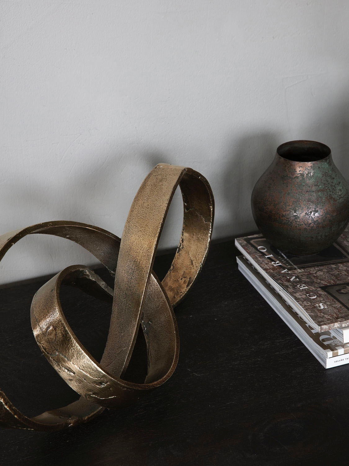 Nauji ist eine verspielte und etwas andere Alternative, um das Zuhause zu verschönern. Diese einzigartige Skulptur ist aus Aluminium gefertigt und hat eine daran anschließende kupferne Legierung. Nauji ist die perfekte Ergänzung zu einem persönlichen Arrangement, das von kleineren Dekorationsobjekten umgeben ist. Wie auch immer, sie ist auch für sich wunderschön und ein richtiger Eye-Catcher auf einer Regalwand oder einem Bücherregal. Das Design der Skulptur ist zu einem Punkt hin verdreht, wo sie sich beinahe selbst in einen Knoten wandelt.