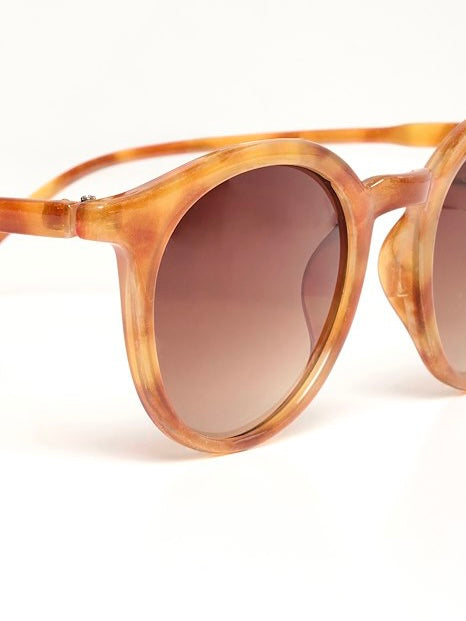 Modern sunglasses with a light brown tortoise-shell frame and round lenses. Medium tint. Comes with a case.