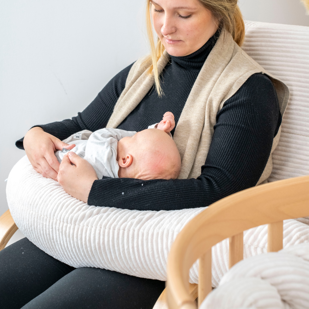 Mit einer Länge von 1,40 m am äußeren Bogen bietet das Kissen noch mehr Platz – ideal auch für größere Babys oder Zwillinge. Auch beim Fläschchengeben sorgt es für eine entspannte, ergonomische Position.