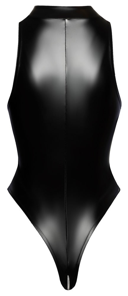 Highly stretchy body from Noir in elegant black powerwetlook. In a close-fitting cut with practical, erotic, silver-coloured 3-way zip that leads from the stand-up collar down to the crotch. Extra high leg cut-outs make the bottom and legs irresistible.