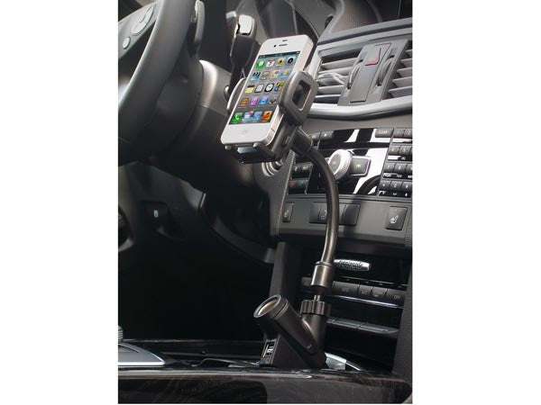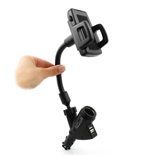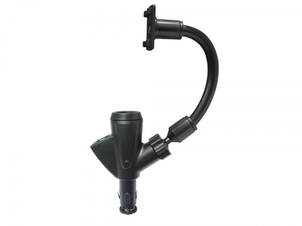 This practical 2-in-1 car charger features an integrated holder for your smartphone or navigation device. Plug the charger into your car's cigarette lighter. You can then connect another car charger and two USB cables. The integrated holder features a continuously adjustable arm and can accommodate objects with a width of approximately 4 cm - 8.5 cm.