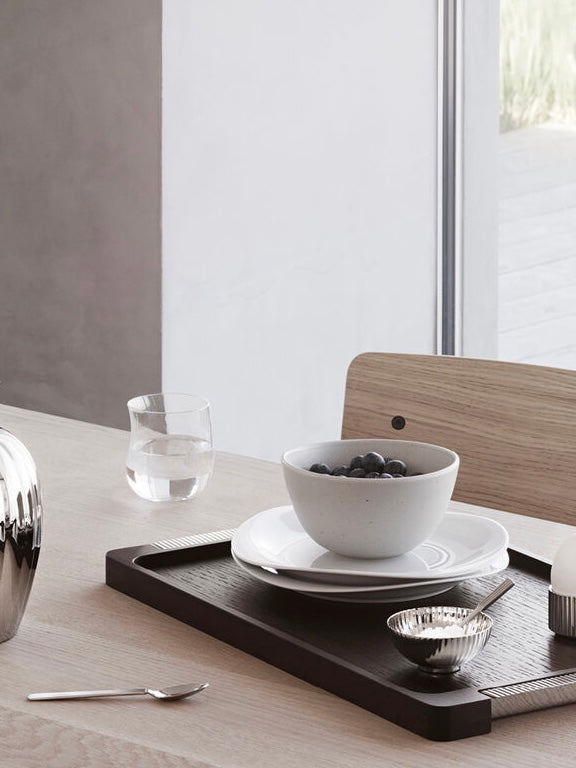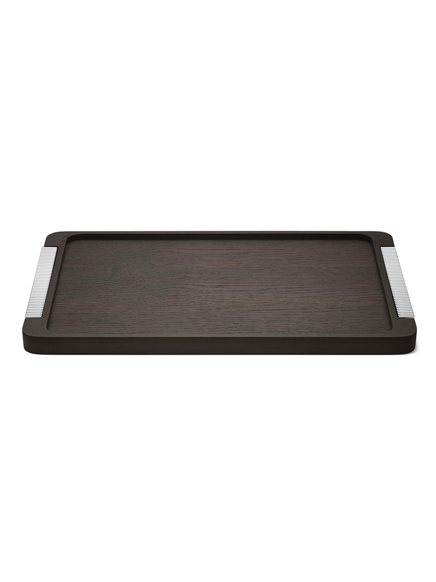 Wie du Speisen oder Getränke präsentierst, ist ein wichtiger Bestandteil der Dinnerparty zu Hause. Serviere also mit diesem eleganten Tablett mit etwas mehr Stil! Das Tablett ist wunderschön aus geräucherter Eiche gefertigt und hat Griffe aus Edelstahl, die die typischen Art-Deco-inspirierten Rillen des legendären Designers Sigvard Bernadotte aufweisen. Es kombiniert meisterhaft Funktionalität und Schönheit und hat die perfekte Größe für das Frühstück im Bett oder zum Servieren von Cocktails auf der Dinnerparty. Wenn es nicht verwendet wird, ist es ein stilvolles Dekorationsobjekt auf einem Tisch oder Regal und eine perfekte Ergänzung für jedes stilvolle Zuhause.