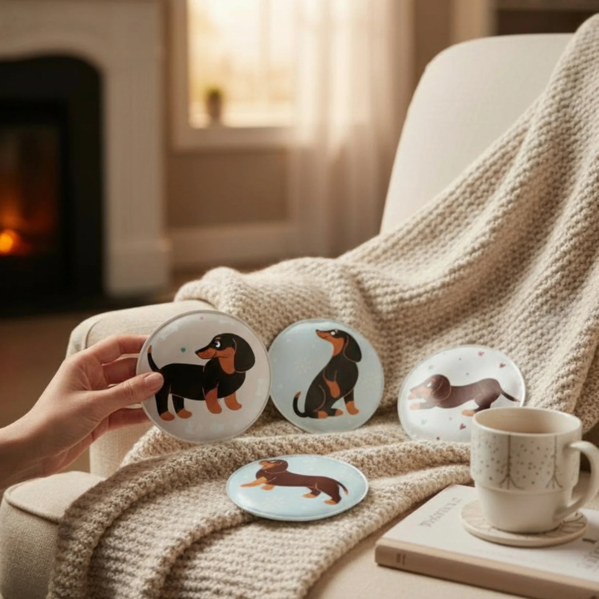 - Design: 4er Set, jeweils mit einzigartigem Dackelmotiv für individuellen Stil