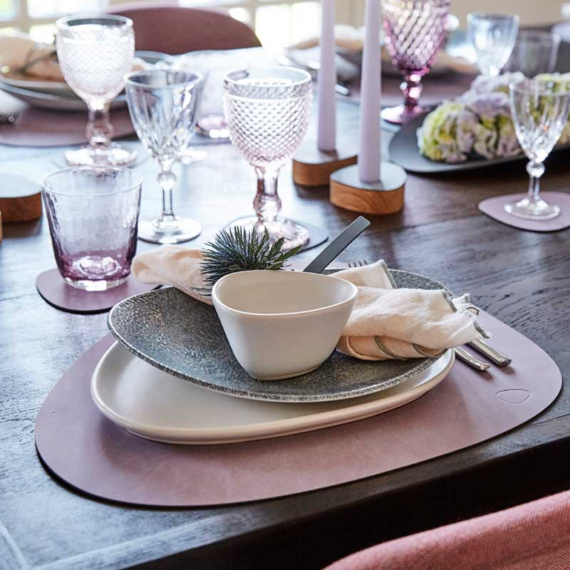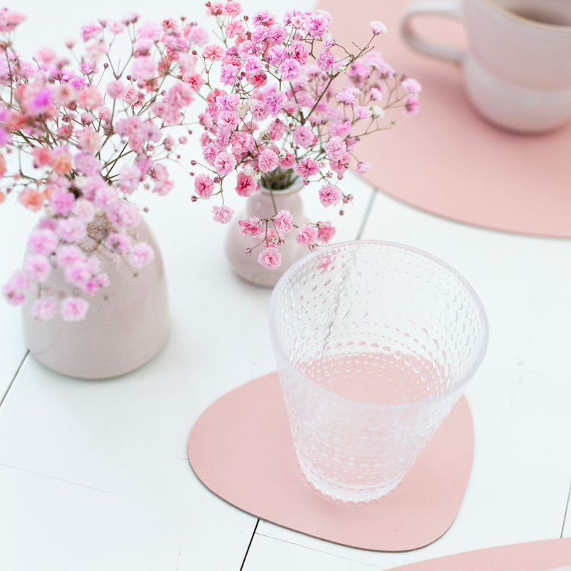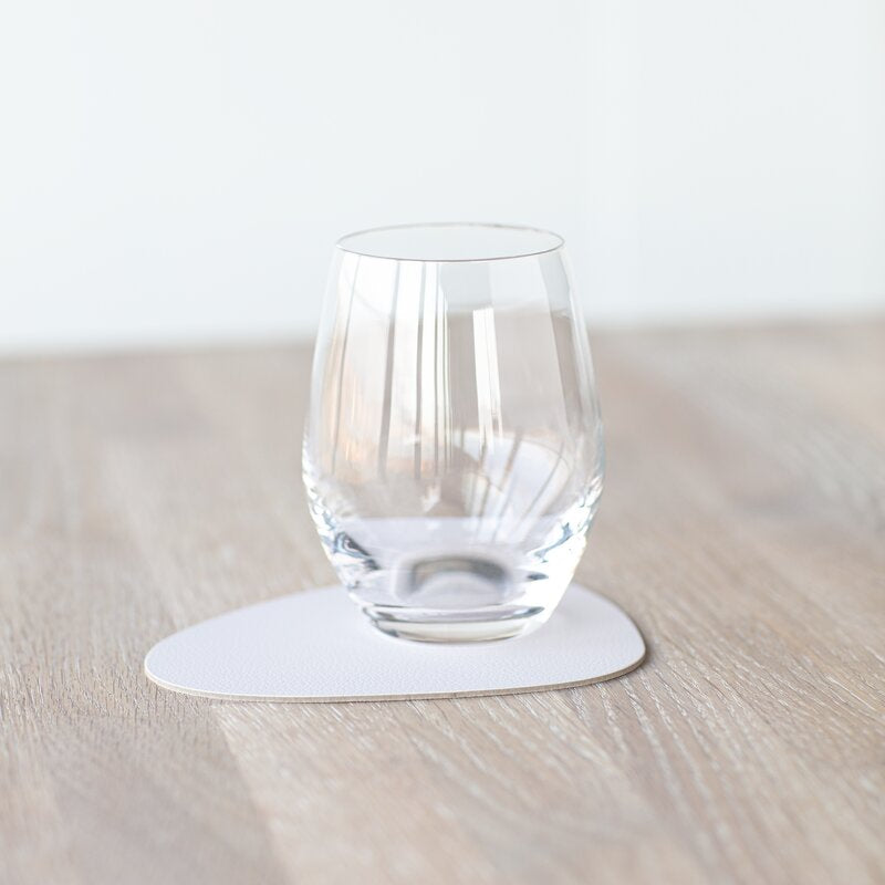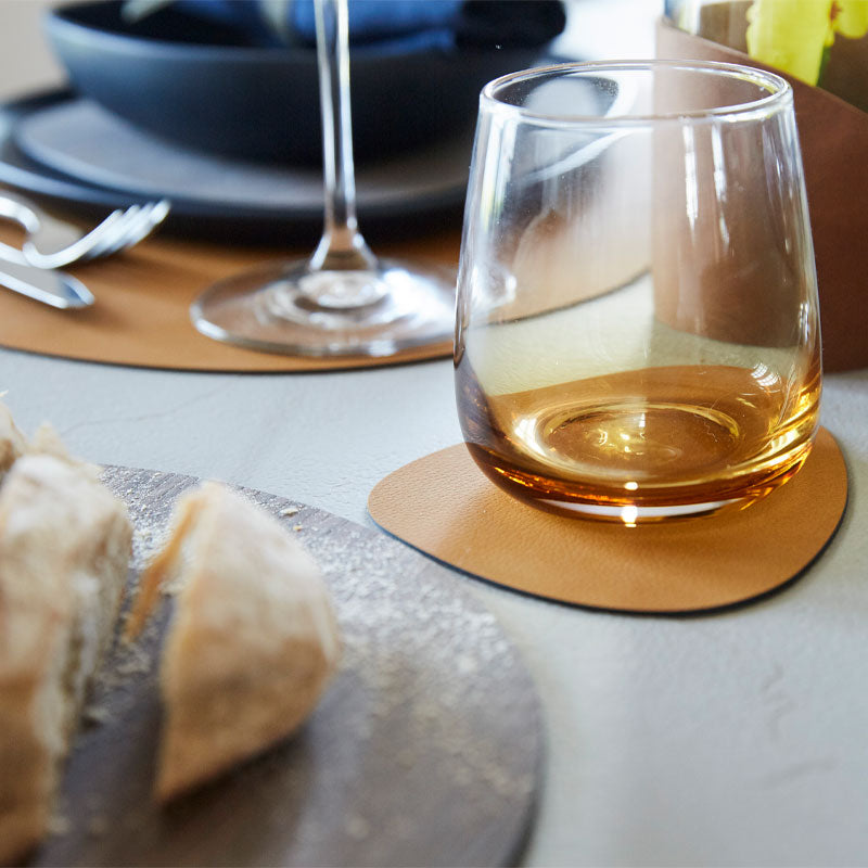 Glasuntersetzer aus recyceltem Leder und Naturkautschuk. Die Oberfläche ist leicht mit einem feuchten Tuch zu reinigen. Die ausgefallene Form setzt einen besonderen Akzent.