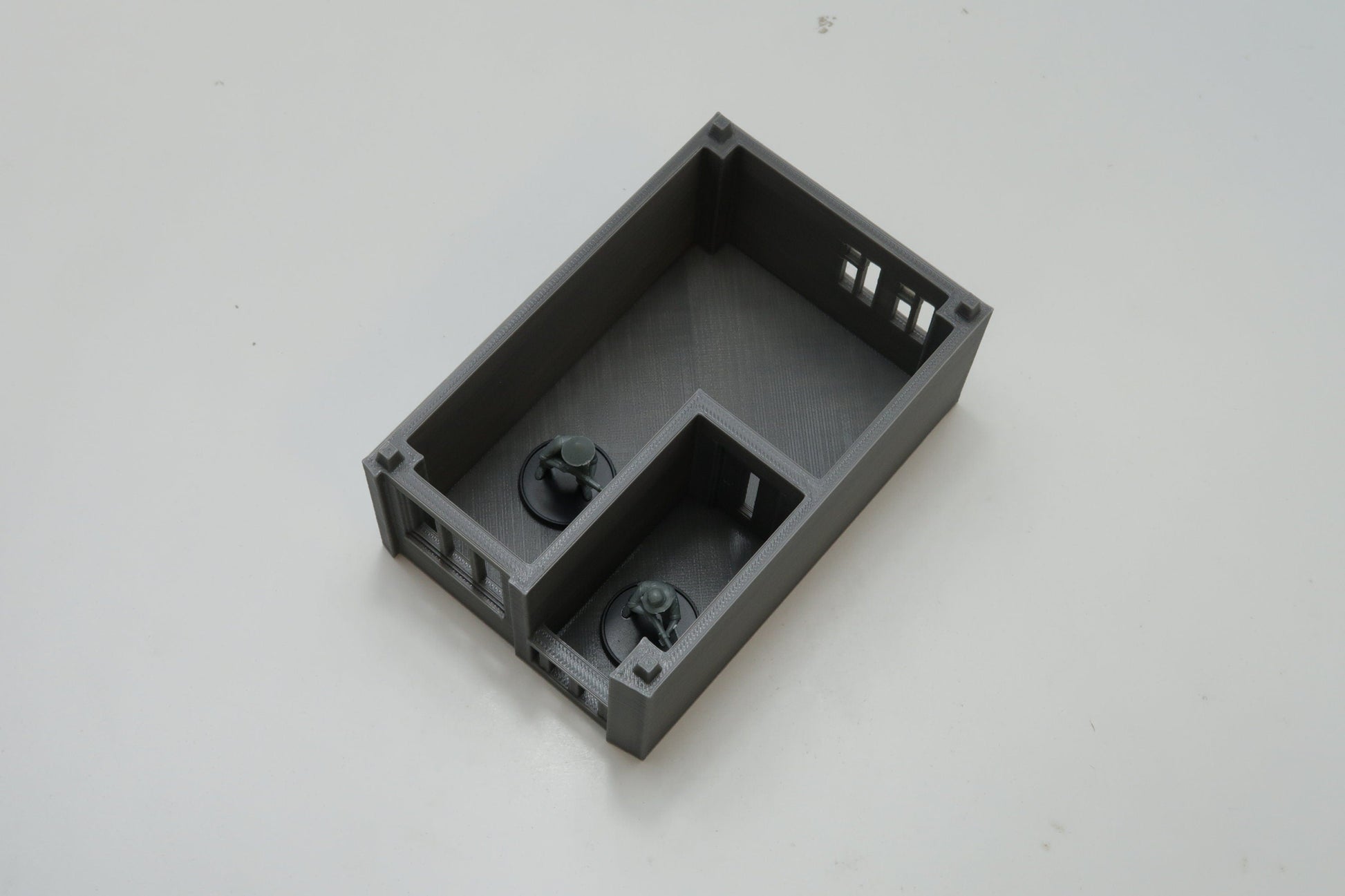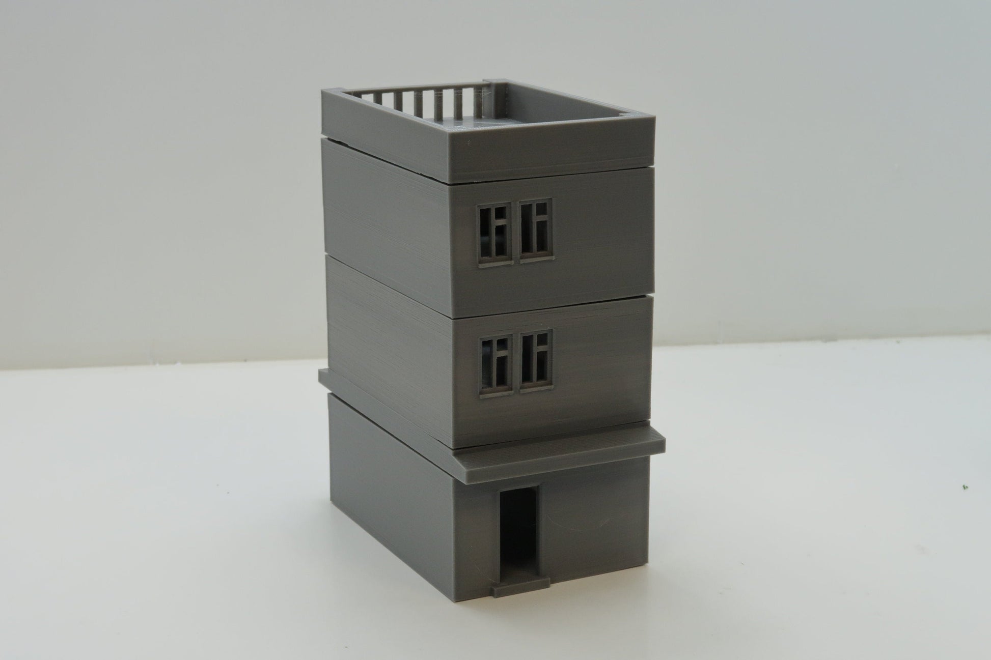 All parts are unpainted and unprimed. I do the cleanup, but some tiny fibers may still be present. It may come in grey or black. A building is created from stackable sections, as shown in the images.