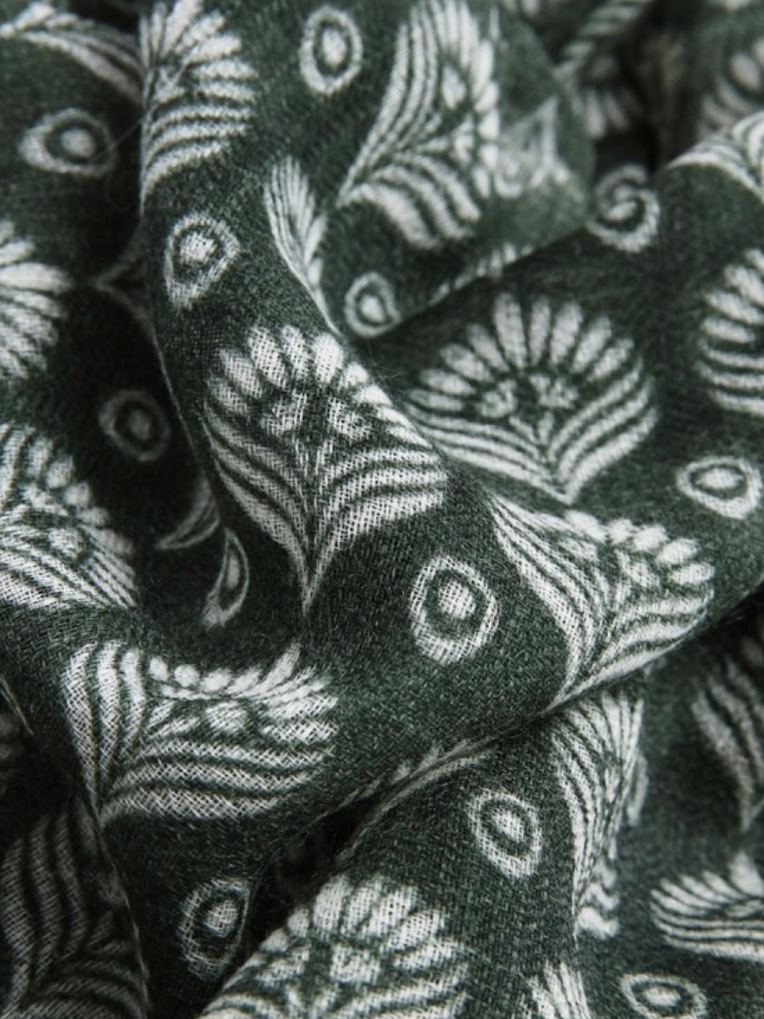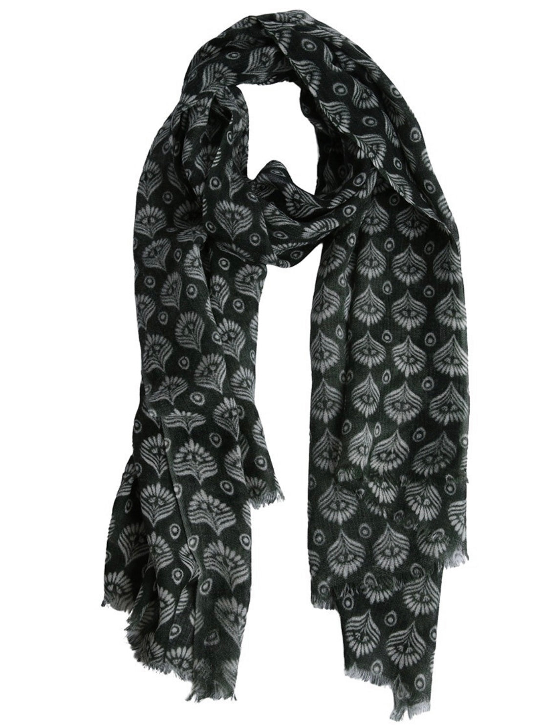 Edler Modeschal mit einem dezenten Floralmuster aus einer hochwertigen Wollqualität. Besonders softes und leichtes Strickgewebe mit kurzen Fransen am Abschluss. Er lässt sich ideal kombinieren.