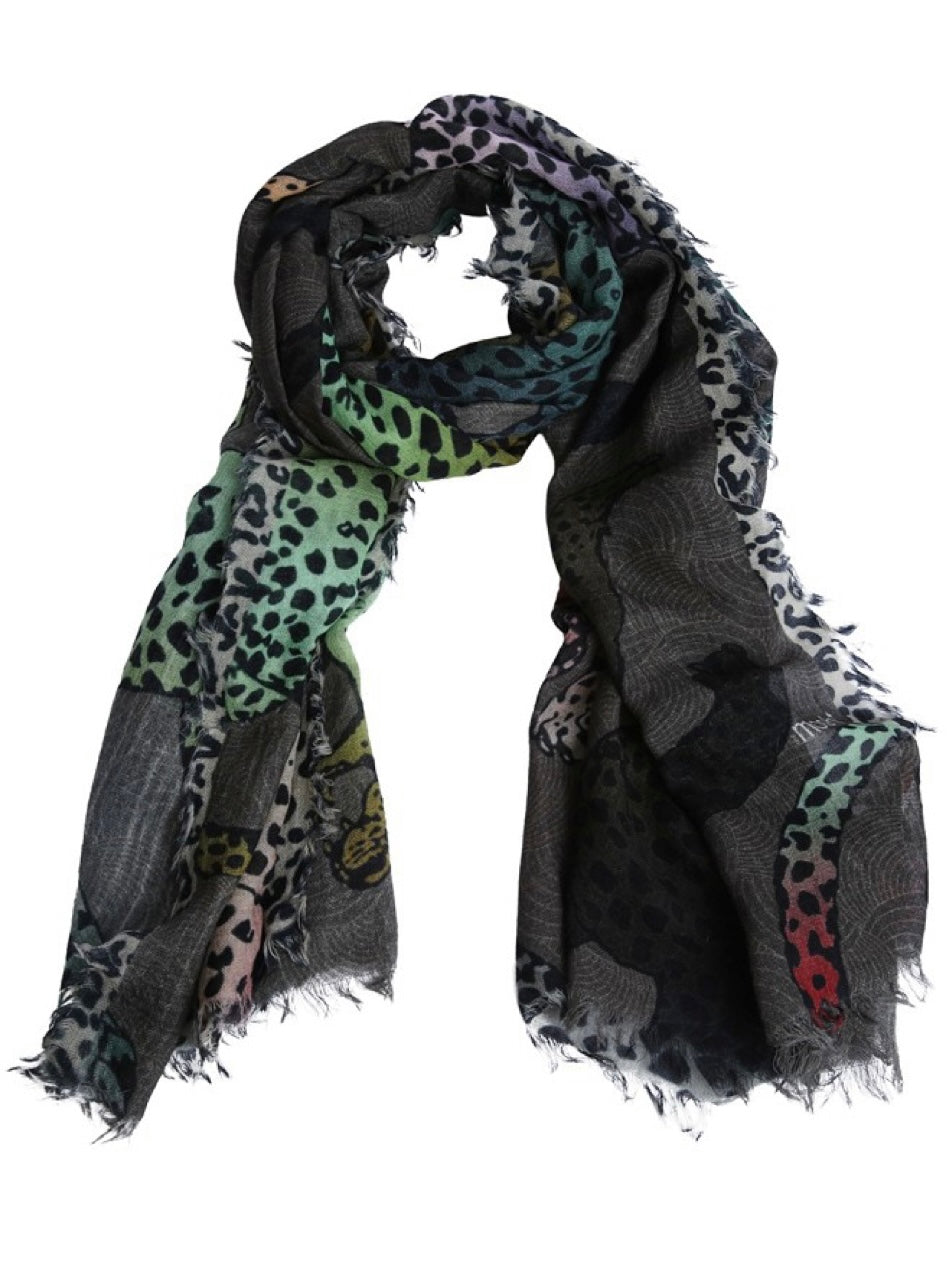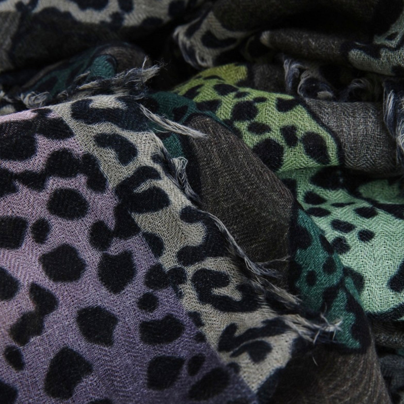 Edler Modeschal mit einem aufwändigen Leomuster in Digitalprint aus einer hochwertigen Wollqualität. Besonders softes und leichtes Strickgewebe mit kurzen Fransen am Abschluss. Er lässt sich ideal kombinieren.