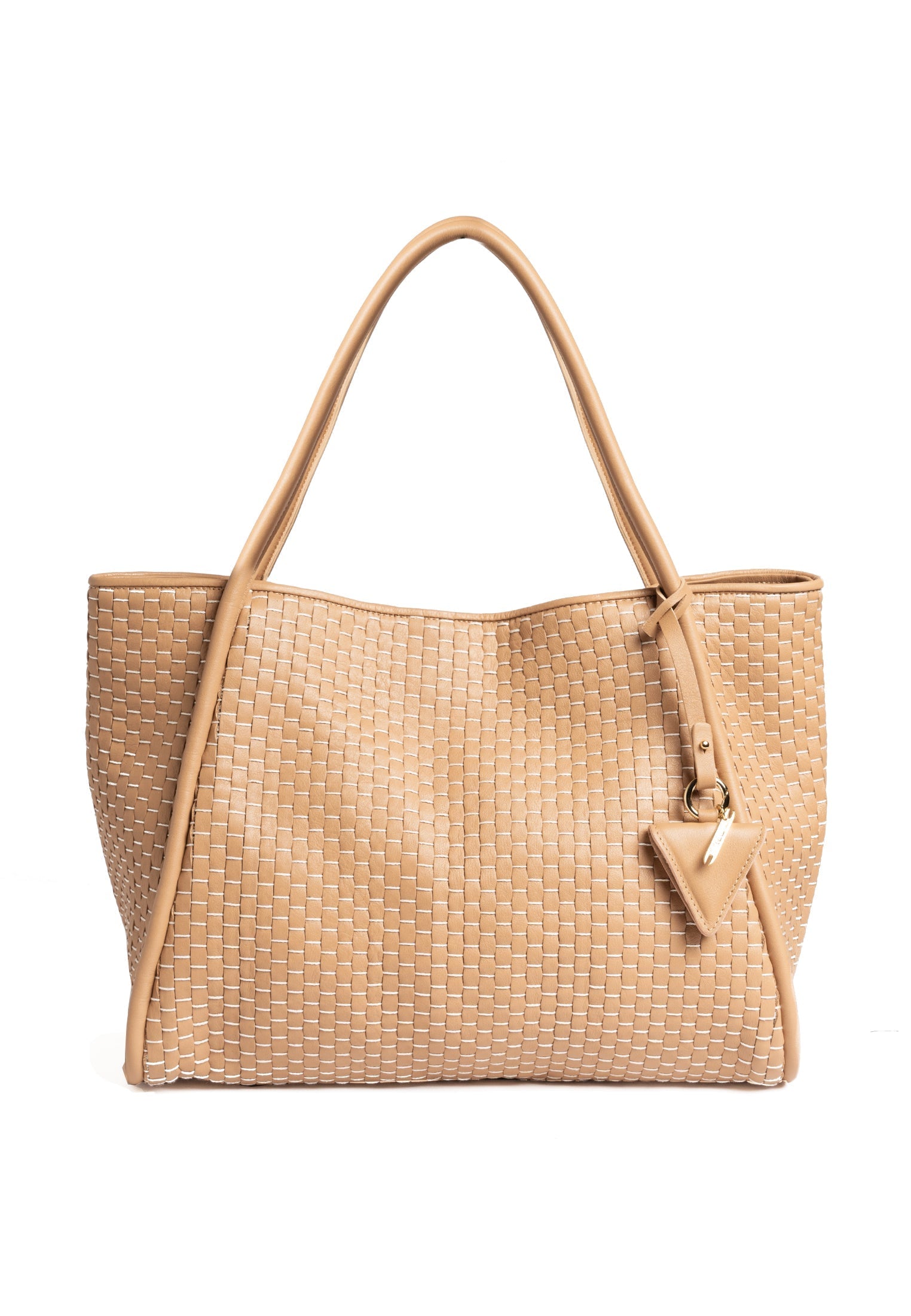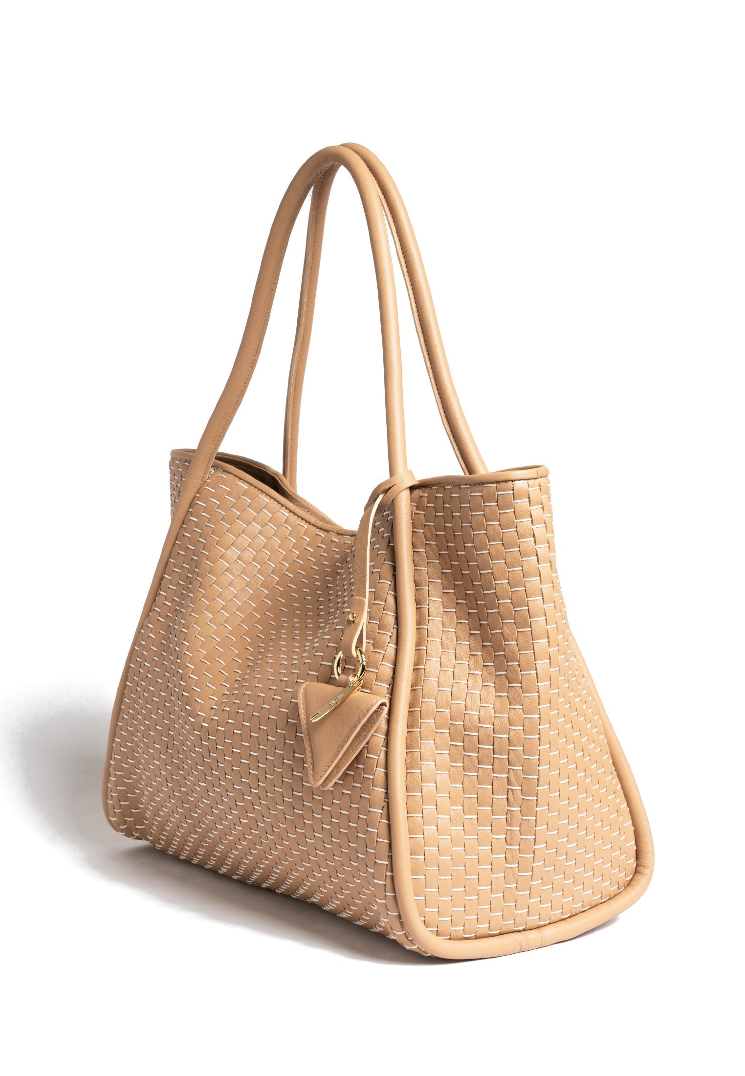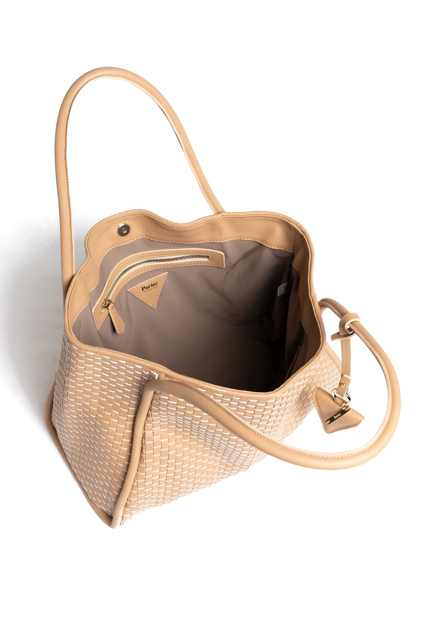 Product: '09' Tubolar & Plain Camel- Edge without fringes for those who prefer more minimalist designs - Double tubolar leather handles that fit easily over coats - Magnetic closure for secure and easy access - Internal zipped pocket and two leather compartments to organise your essentials - White gold colored hardware - Soft and durable 100% cotton lining - Exclusive signature Parise pendant included - Protective dust bag included for lasting beauty - Made in Italy - Premium 100% bovine leather woven with 100% cotton yarn on 18th century treadle looms
