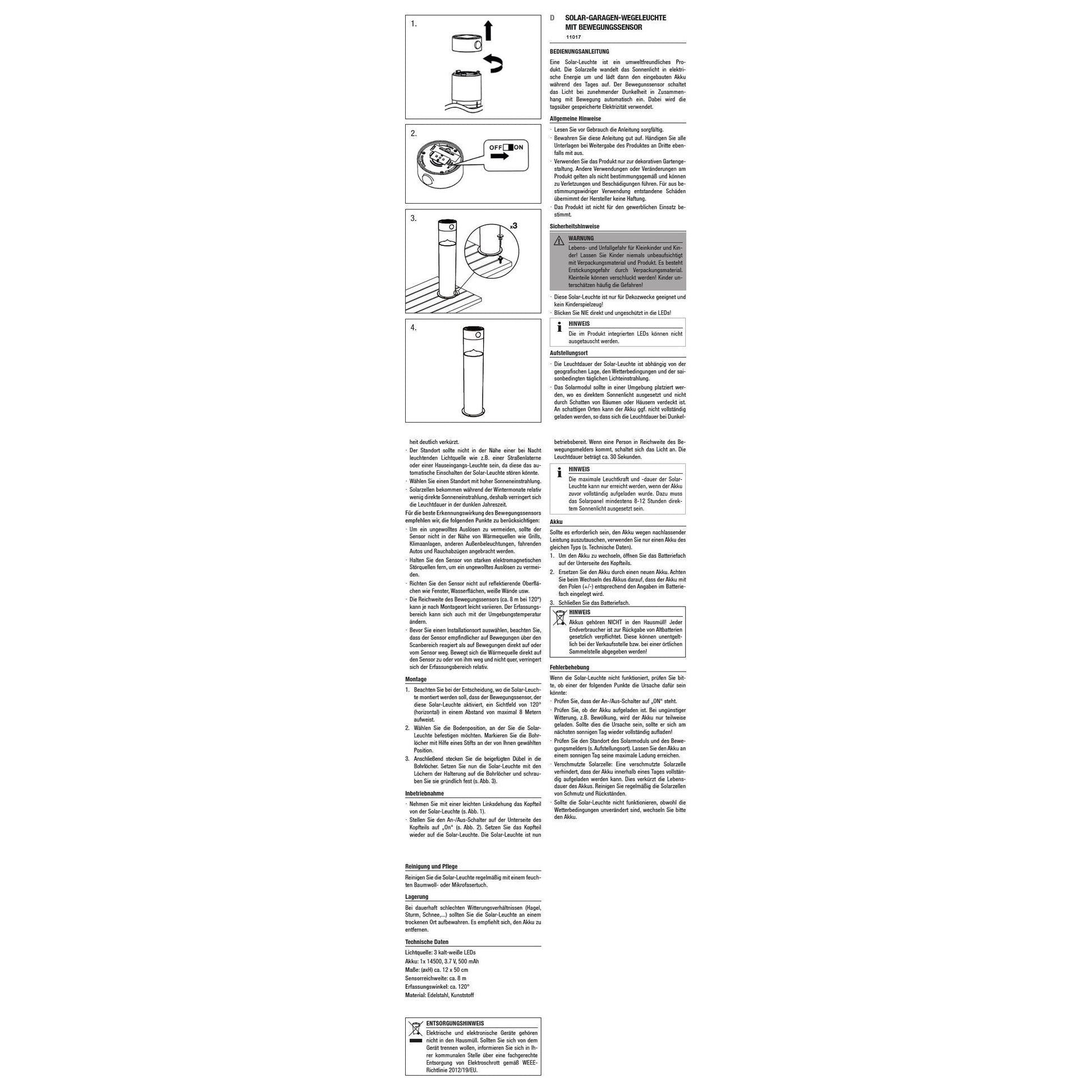 Die Außenleuchte mit 3 kaltweißen LEDs bietet 100 Lumen Helligkeit. Durch den Bewegungsmelder mit 8 Meter Reichweite und 120° Winkel schaltet sich die Leuchte für ca. 30 Sekunden ein.
