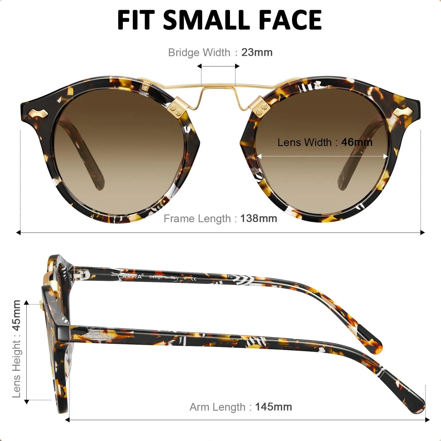 - Retro sólgleraugu fyrir konur með lítil andlit - Við leggjum áherslu á framsæknar umgjörðir þökk sé einstakri samsetningu af nikkelfríum málmbrúnum. Með umgjörðarstærð upp á 126 mm eru þessi sólgleraugu fyrir konur hönnuð og ráðlögð fyrir lítil andlit. Flattrandi sólgleraugu með skautuðum gleraugum fyrir konur bjóða upp á milda glæsileika sem hentar best sporöskjulaga, hjartalaga, ferkantaða, rétthyrnda, þríhyrningslaga og demantlaga andlitum.