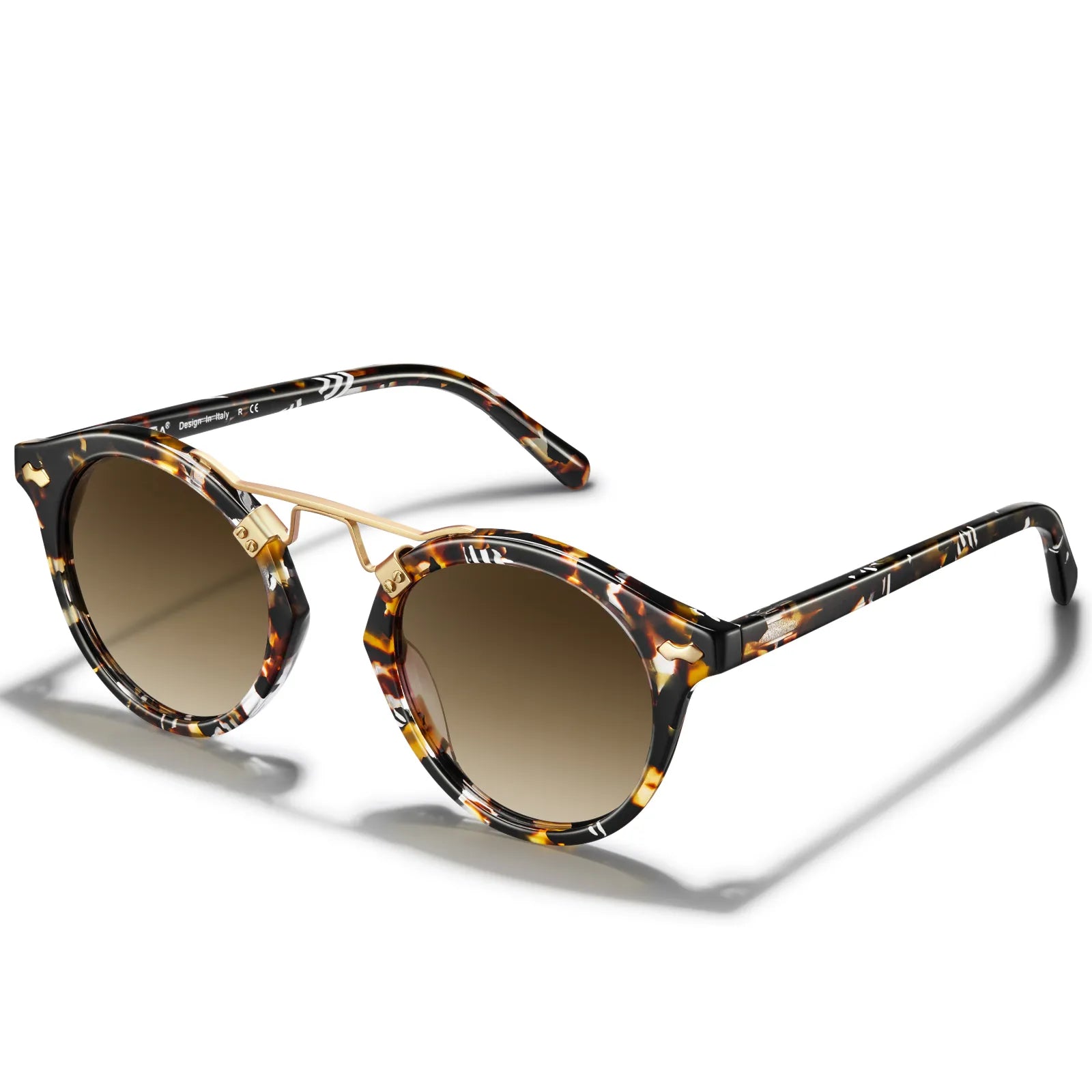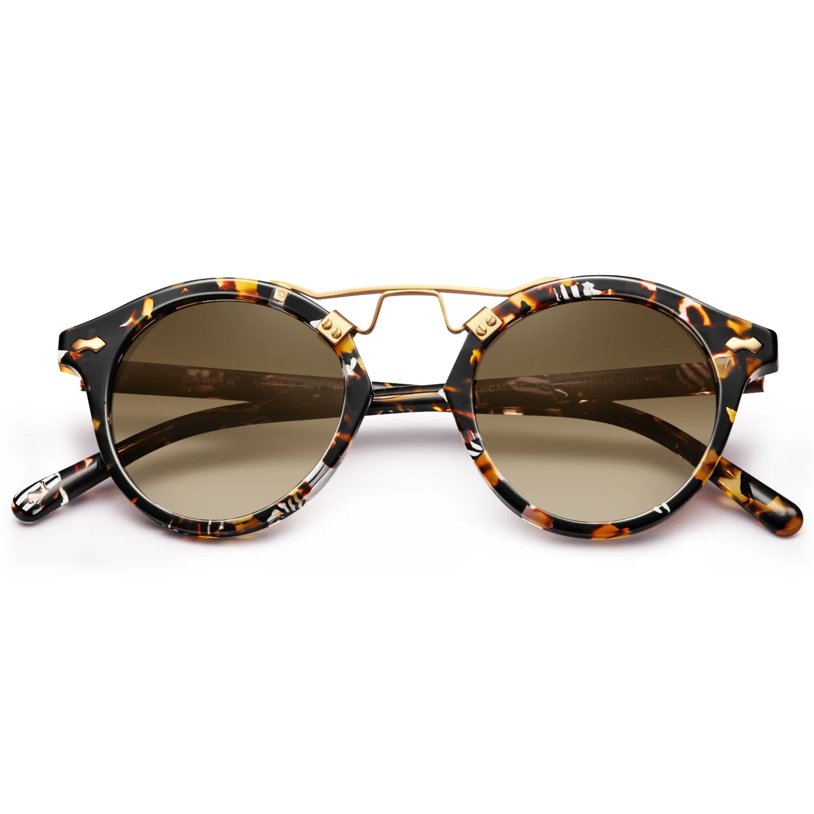 - Sólgleraugu fyrir konur með asetatgrind - Handpússað ítalskt asetatefni sem við notuðum er ofnæmisprófað og glansandi en ódýrt, flagnandi plast. Þess vegna eru kringlóttar sólgleraugu fyrir konur ónæmar fyrir svita/snyrtivörutæringu og hafa ófölnandi mynstur sem tryggir langtímanotkun.