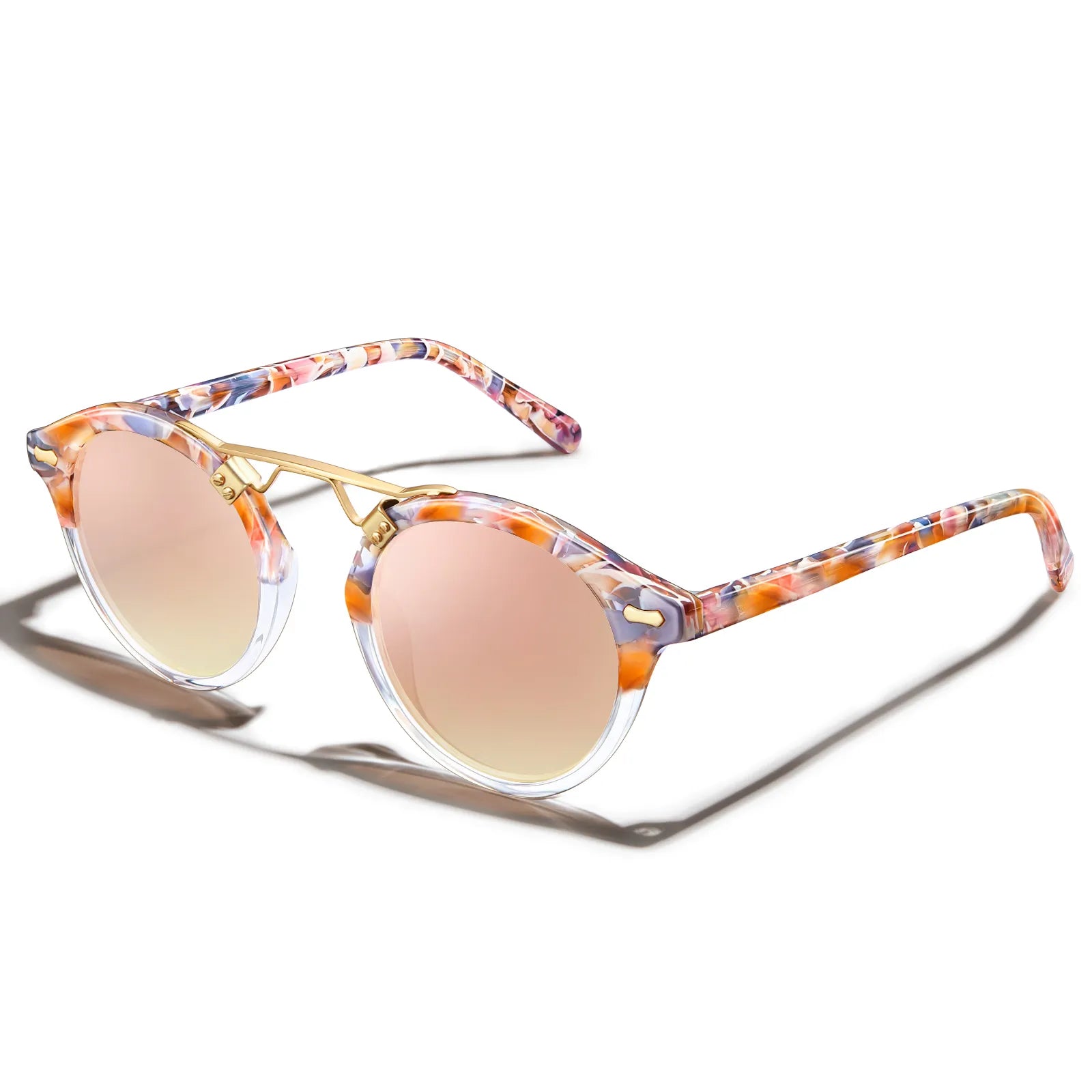 - Kringlótt sólgleraugu fyrir konur - Þessi skautuðu sólgleraugu fyrir konur eru með þriggja hólka málmhjörum, brotþolinni linsu og innbyggðum málmvírkjarna sem auka styrk þeirra. Stöngin opnast og lokast mjúklega með miðlungs þéttleika. Ergonomískir, saumlausir nefpúðar og teygjanlegir stokkar koma í veg fyrir að nef og höfuð klemmist saman og veita þér þægindi allan daginn.