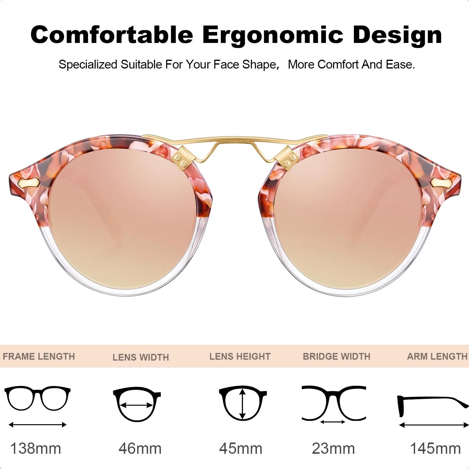 - Sólgleraugu fyrir konur með skautuðum UV-vörn - Speglaðar sólgleraugu fyrir konur eru færar í að blokka 100% af UVA/UVB geislum allt að 400nm og vernda þannig augnheilsu þína. Skautuðu linsurnar útrýma einnig fagmannlega 99% af blindandi glampa sem endurkastast af ýmsum yfirborðum og skila þannig skærum og mettuðum litum, skarpri og skýrri skýrleika og óviðjafnanlegum smáatriðum.