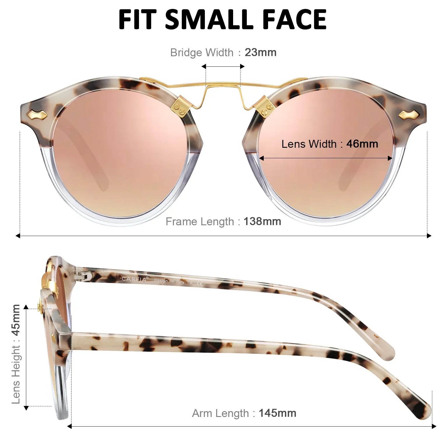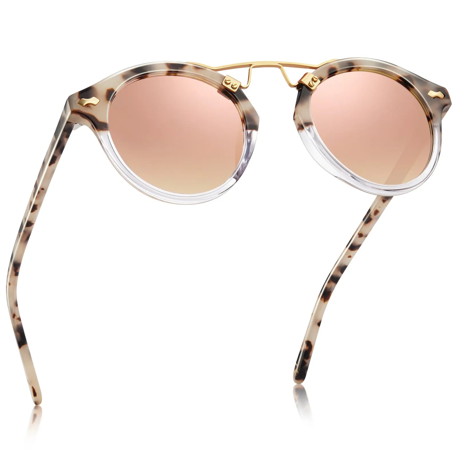 - Sólgleraugu fyrir konur með skautuðum UV-vörn - Speglaðar sólgleraugu fyrir konur geta blokkað 100% UVA/UVB geisla allt að 400nm til að vernda heilbrigði augna þinna. Skautuð sólgleraugu fyrir konur útrýma einnig 99% af blindandi glampa sem endurkastast af ýmsum yfirborðum og bjóða upp á skærlita, skýra birtu og einstaka smáatriði.