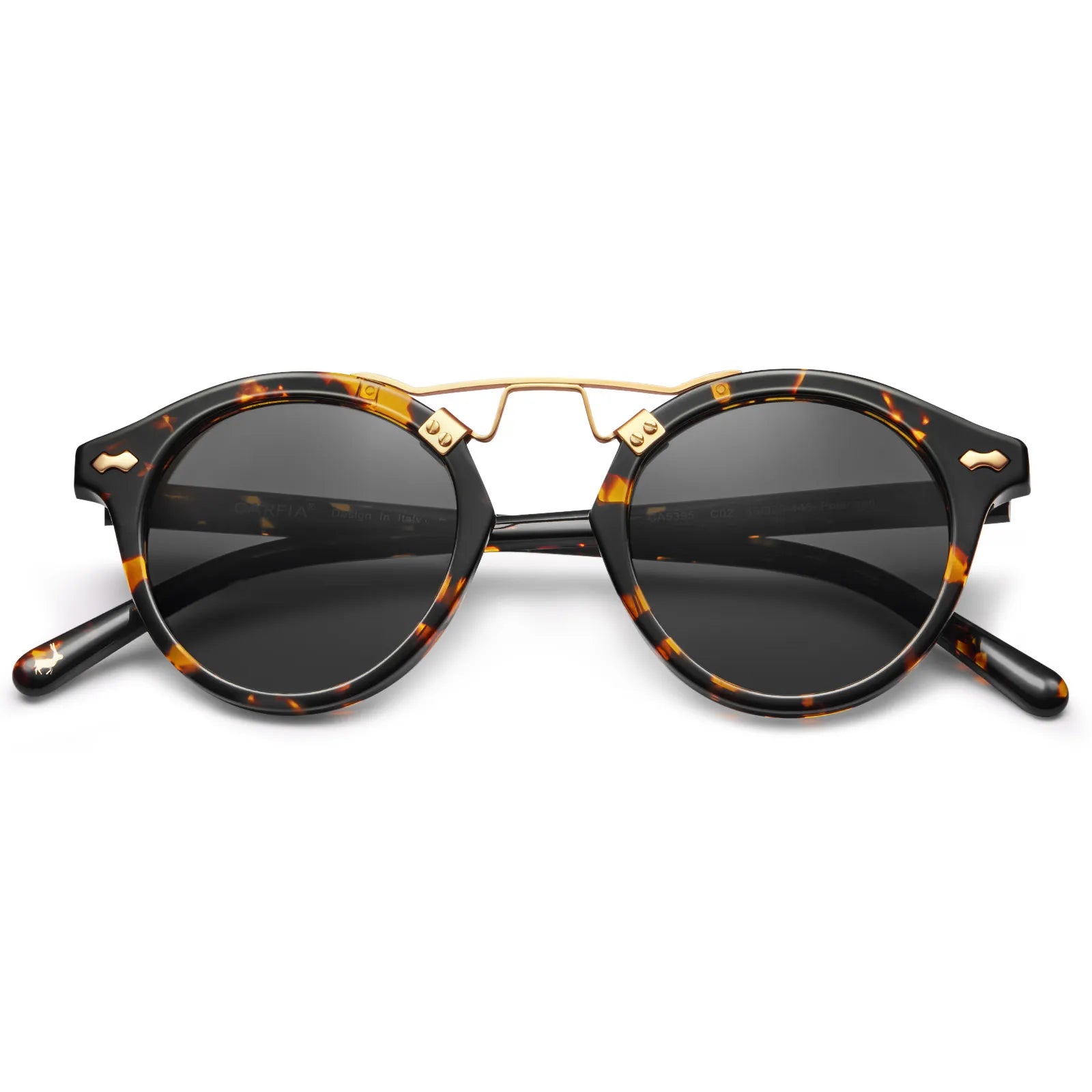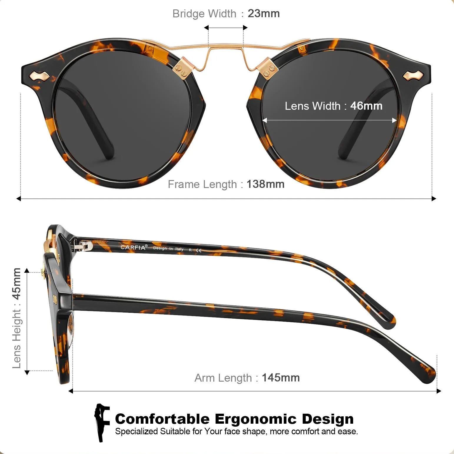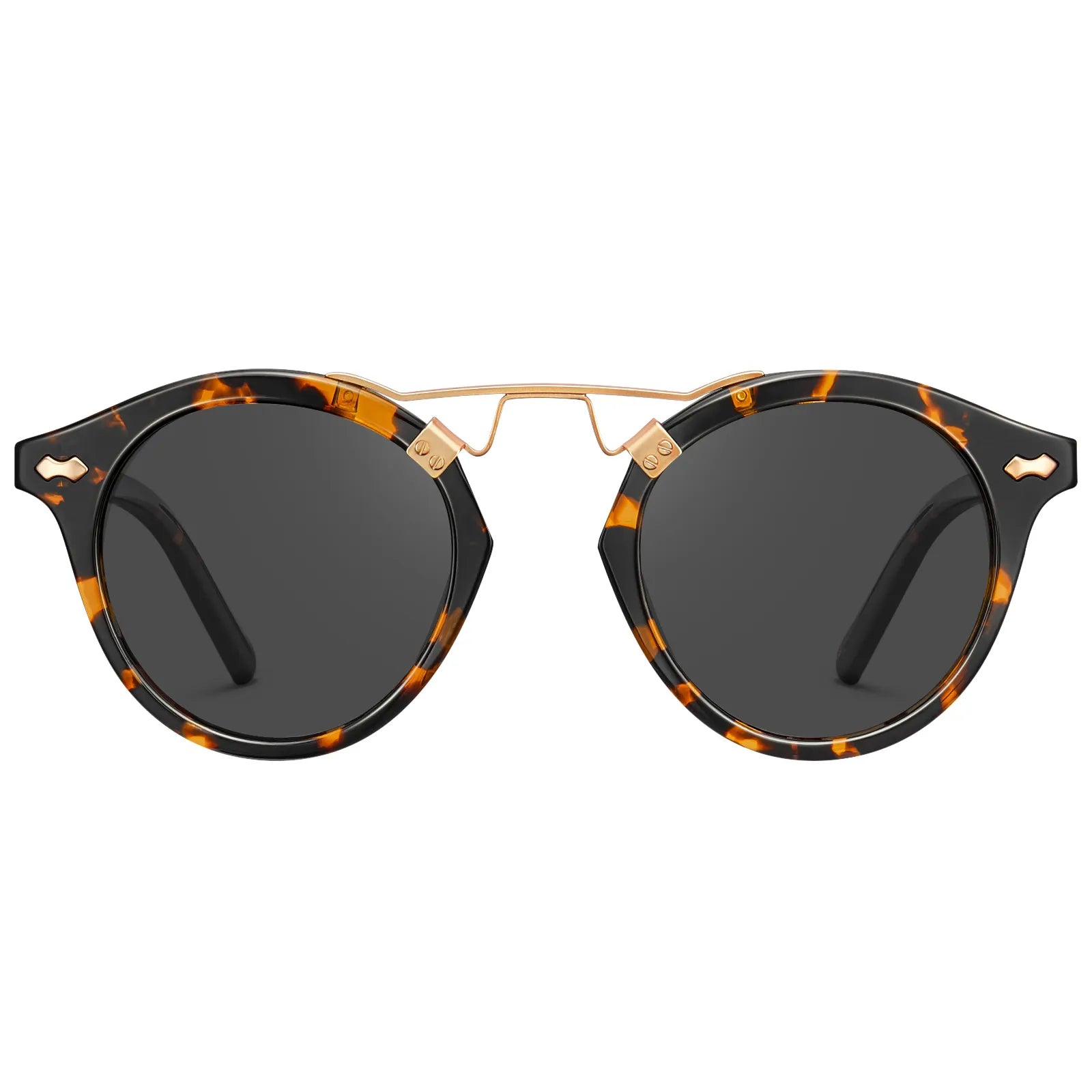 - Sólgleraugu fyrir konur með asetatgrind - Handpússað ítalskt asetatefni sem við notum er ofnæmisprófað og glansandi í samanburði við ódýrt, flagnandi plast. Þess vegna eru kringlóttu sólgleraugun fyrir konur ónæm fyrir svita og tæringu snyrtivara og viðhalda ófölnandi mynstri sínu í langan tíma.