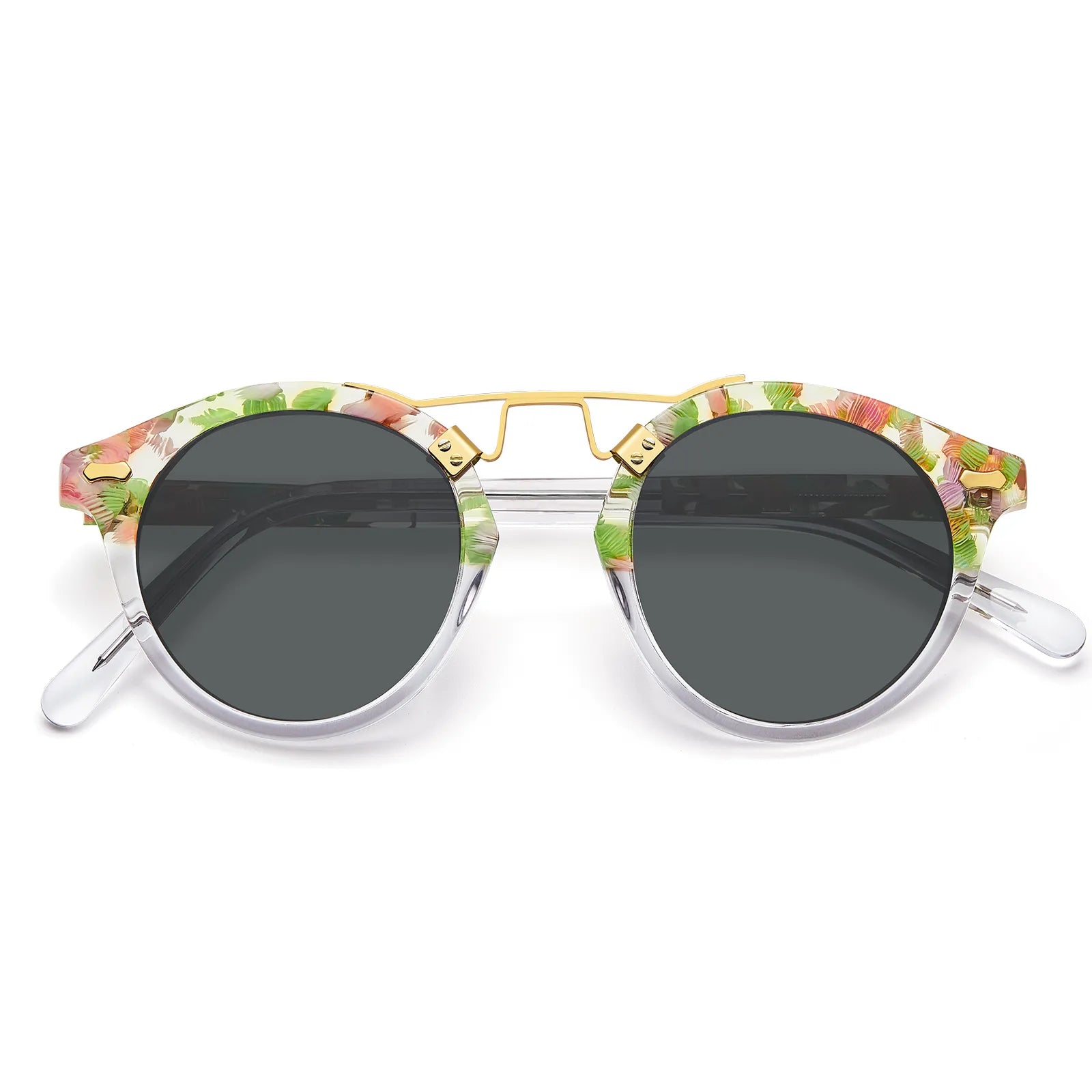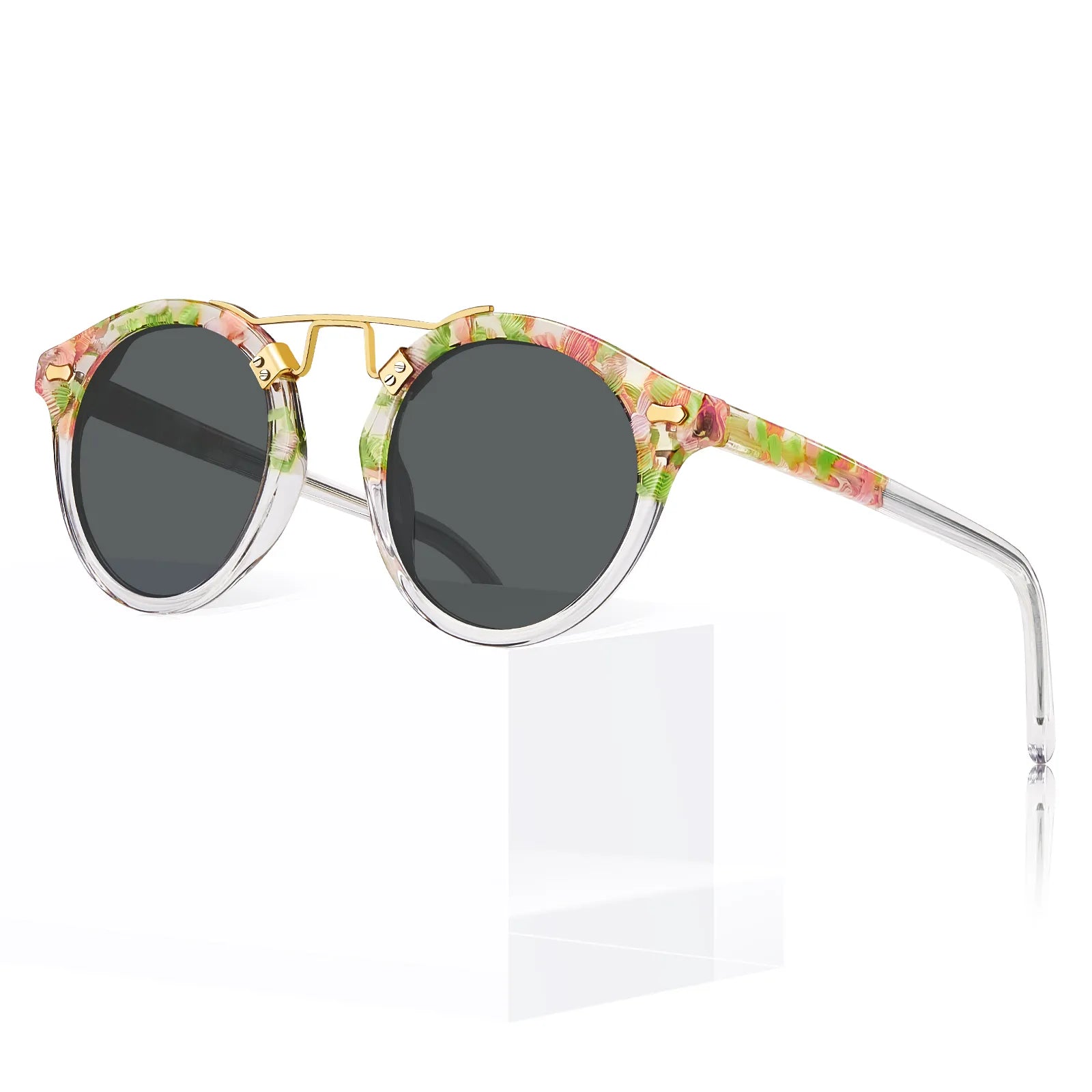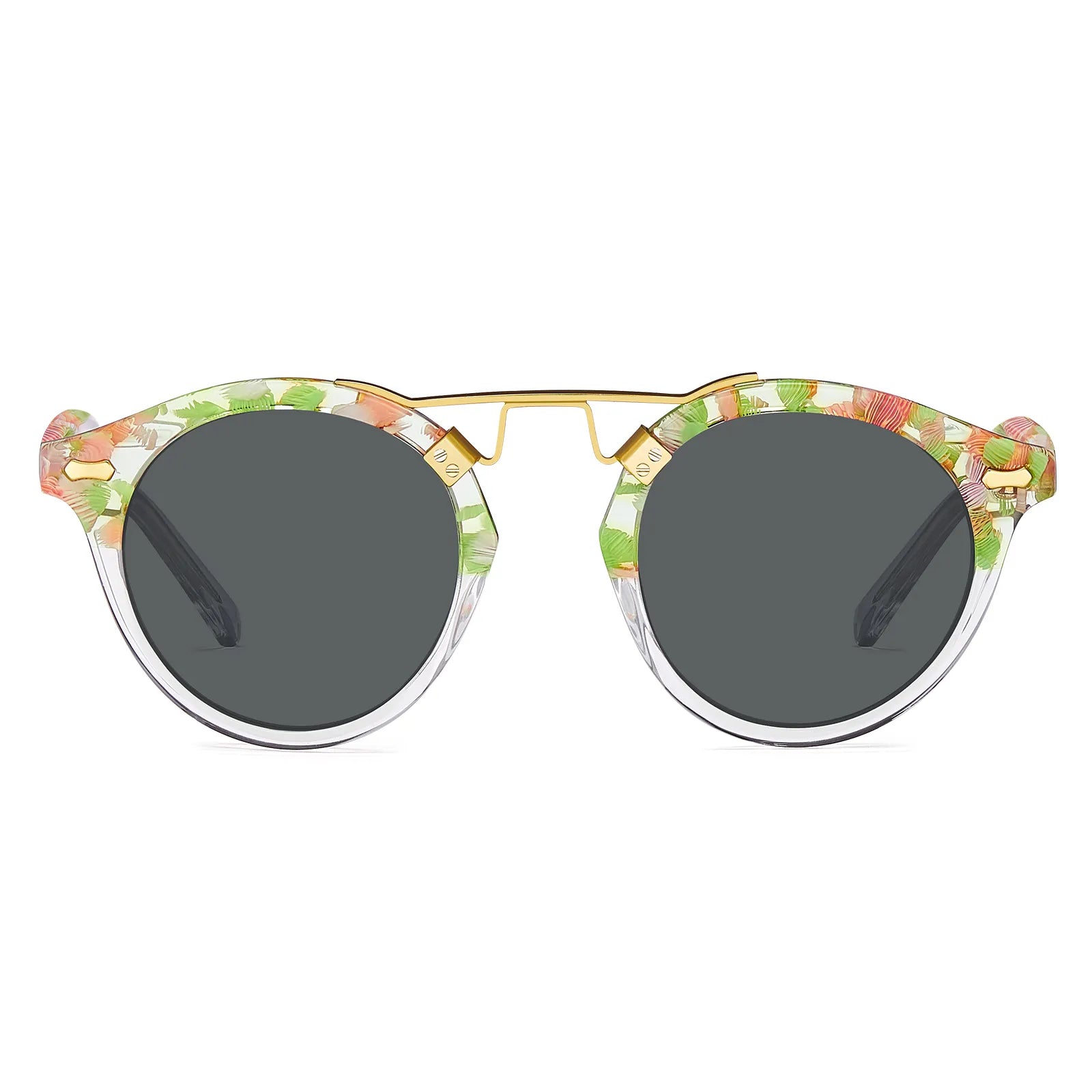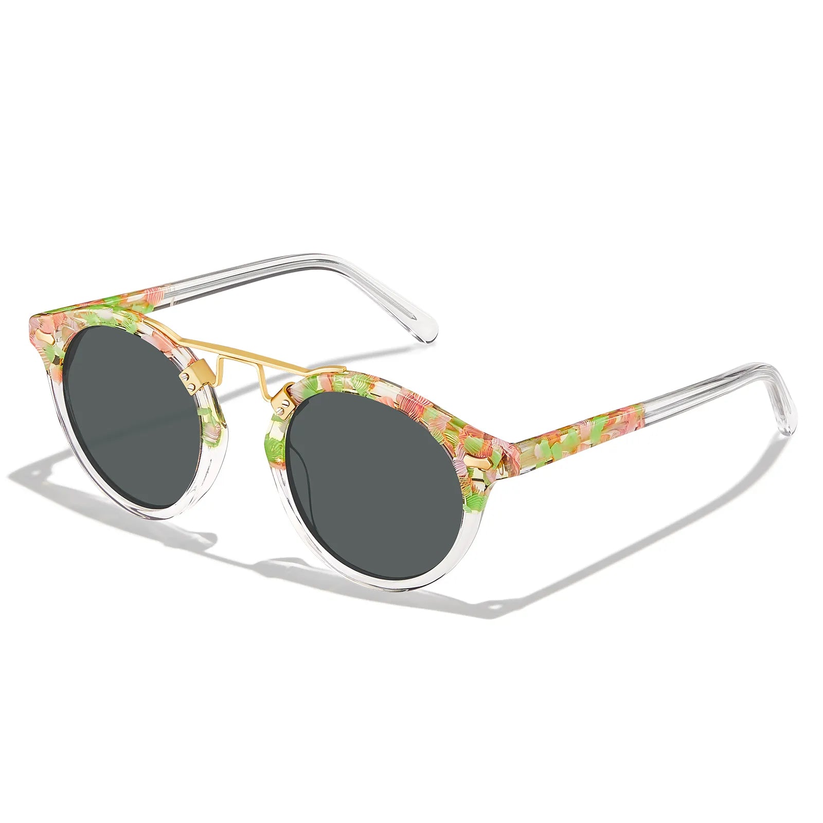 - Sólgleraugu fyrir konur með asetatgrænum skjaldbökugrind - Handpússað ítalskt asetatefni sem við höfum notað er ofnæmisprófað og glansandi í stað ódýrs, flagnandi plasts. Þar af leiðandi eru kringlóttu sólgleraugun fyrir konur ónæm fyrir svita og snyrtivörutæringu og halda ófölnandi mynstri sínu til langs tíma litið.