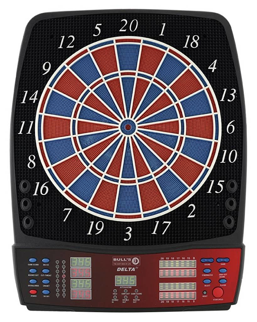 Rafræn pílukastskífa frá E-Dart Bull, Delta IV, með tveggja holu segmentum, með aflgjafa, LED skjá, 4 krikketskjám, 12 pílum og 30 varaoddum. Fyrir allt að 16 leikmenn, 38 leiki, 130 afbrigði, stigagjöf sem hoppar út, stillanleg hljóð og hljóðáhrif. Tvöföld inn/tvöföld út virkni. Fyrir 14 ára og eldri. NÝTT með óyggjandi rödd PDC-kallarans Russ Bray.