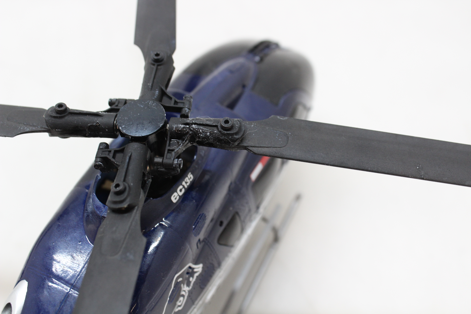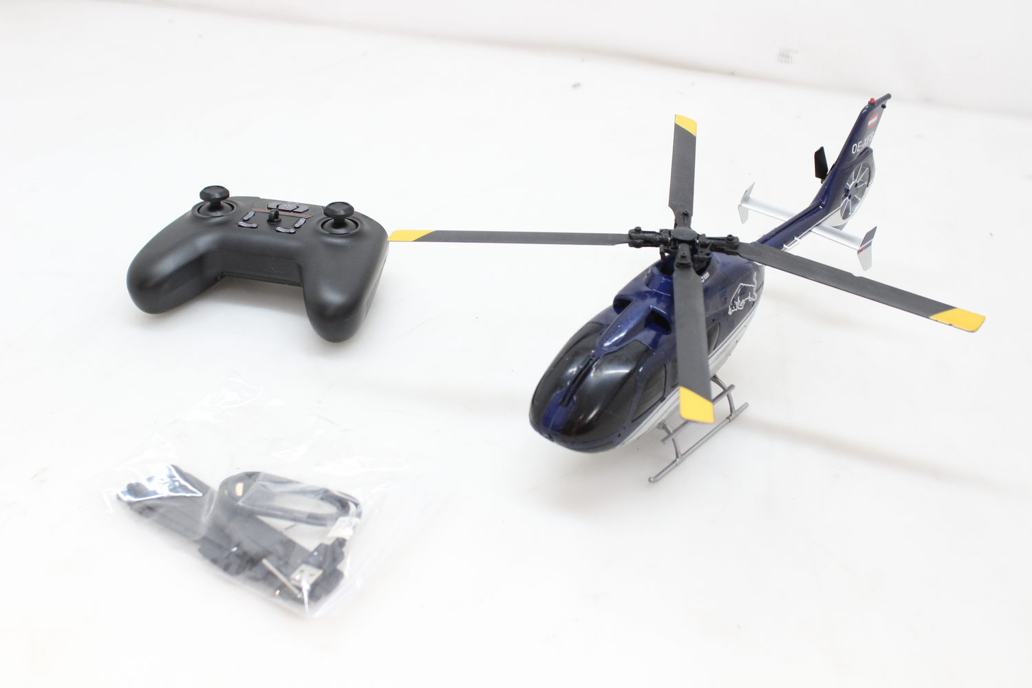 Það sem helst einkennir rafhlöðuna er innbyggða USB hleðslutengið sem tengist einfaldlega við meðfylgjandi USB snúru. Full rafhlaða gefur um það bil 8-10 mínútna flugtíma. Þökk sé hágæða rafeindabúnaði, þar á meðal sjálfvirkri ræsingu og sjálfvirkri lendingu, eru flugeiginleikar þyrlunnar þægilegir, sem gerir hana hentuga fyrir byrjendur þrátt fyrir fjölblaða snúningshaus. Þægilegur, hágæða 2,4 GHz sendandi býður upp á valfrjálsa flugstillingu (frá byrjendum til lengra kominna), vinnuvistfræðileg stjórnstöng og möguleika á að skipta á milli stillingar 2 (verksmiðjustilling) og stillingar 1. Að auki gerir EC-135 kleift að snúa fluginu við með því að ýta á takka þegar öruggri hæð upp á um það bil níu metra er náð. Til að tryggja nægilegt afl fyrir slíkar hreyfingar er risastóri þyrlan búin tveimur öflugum burstalausum mótorum (framan/aftan). Aðrir eiginleikar eru meðal annars sjálfvirk hæðarhald með ýmsum sjón- og rafrænum skynjurum. Þyrlan er afhent sem RTF (Ready-to-Fly) útgáfa, sem þýðir að allir íhlutir – nema venjulegar heimilisrafhlöður fyrir fjarstýringuna – eru þegar innifaldir í pakkanum og hægt er að ræsa þyrluna strax eftir að rafhlaðan hefur verið hlaðin.
