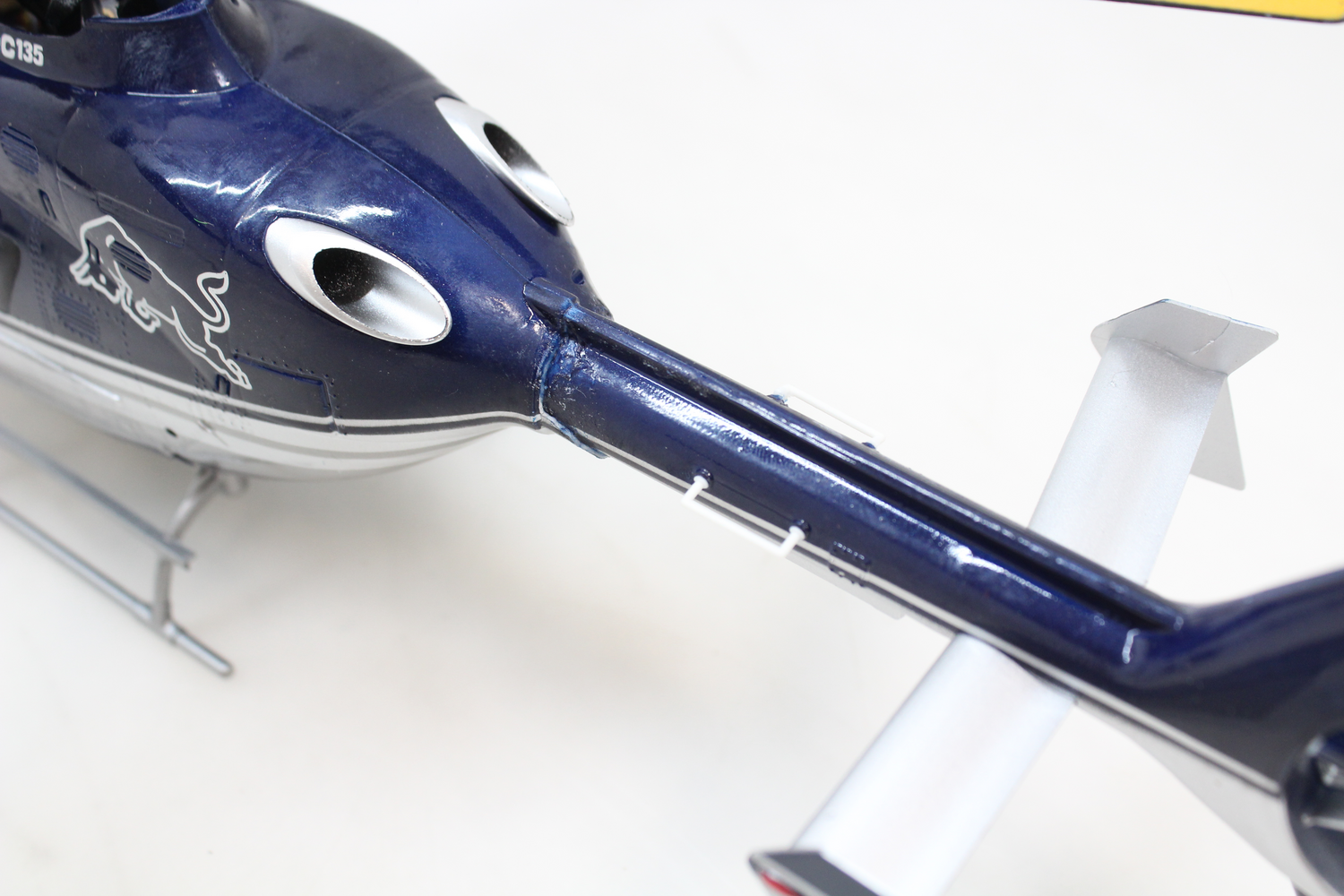 EC-135 þyrlan okkar er leyfisbundin eftirlíking í risastórum stíl í mælikvarða 1:32 með upprunalegu Flying Bulls útliti. Líkanið er nánast óaðgreinanlegt frá hinu raunverulega – jafnvel einstakar nítur á plaststjórnklefanum eru sýndar. Þessi þyrla er með LED-lýsingu að framan, neðan og aftan, sem ekki aðeins fullkomnar glæsilegt útlit hennar og gerir kleift að fljúga í rökkri, heldur veitir einnig upplýsingar um núverandi flugstöðu og rafhlöðuspennu. Ef LED-ljósið byrjar að blikka og verður rautt er spennan of lág, þannig að flugmaðurinn veit strax að best er að snúa aftur til að hlaða.